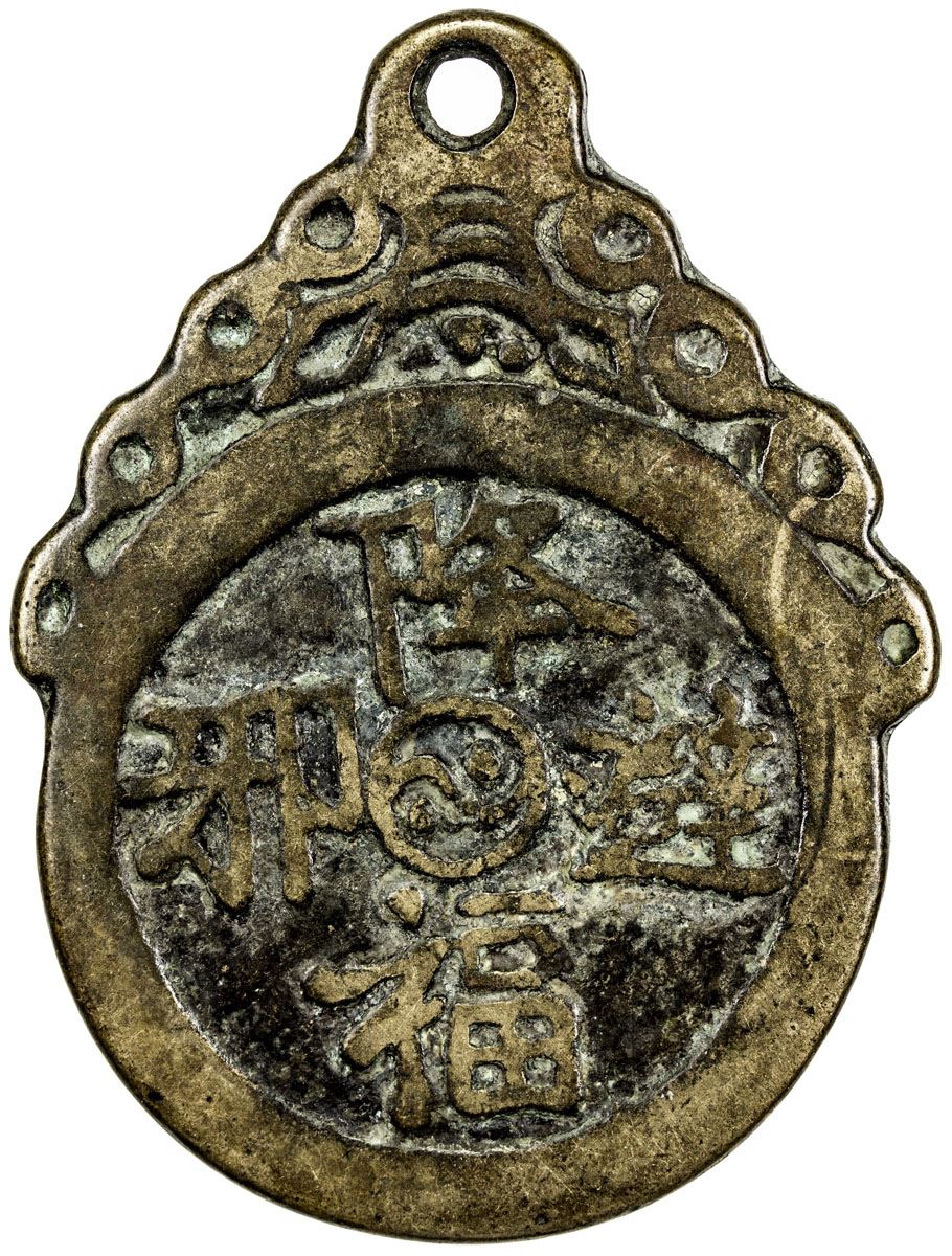 CHINA: AE charm, CCH-2481, 41x55mm, hanging charm type, jiàng fú bì xié (send down good fortune and keep away evil) // eight trigrams with inscription qián kan gèn zhèn xùn lí kun duì around, yin and yang symbol at center either side, VF.