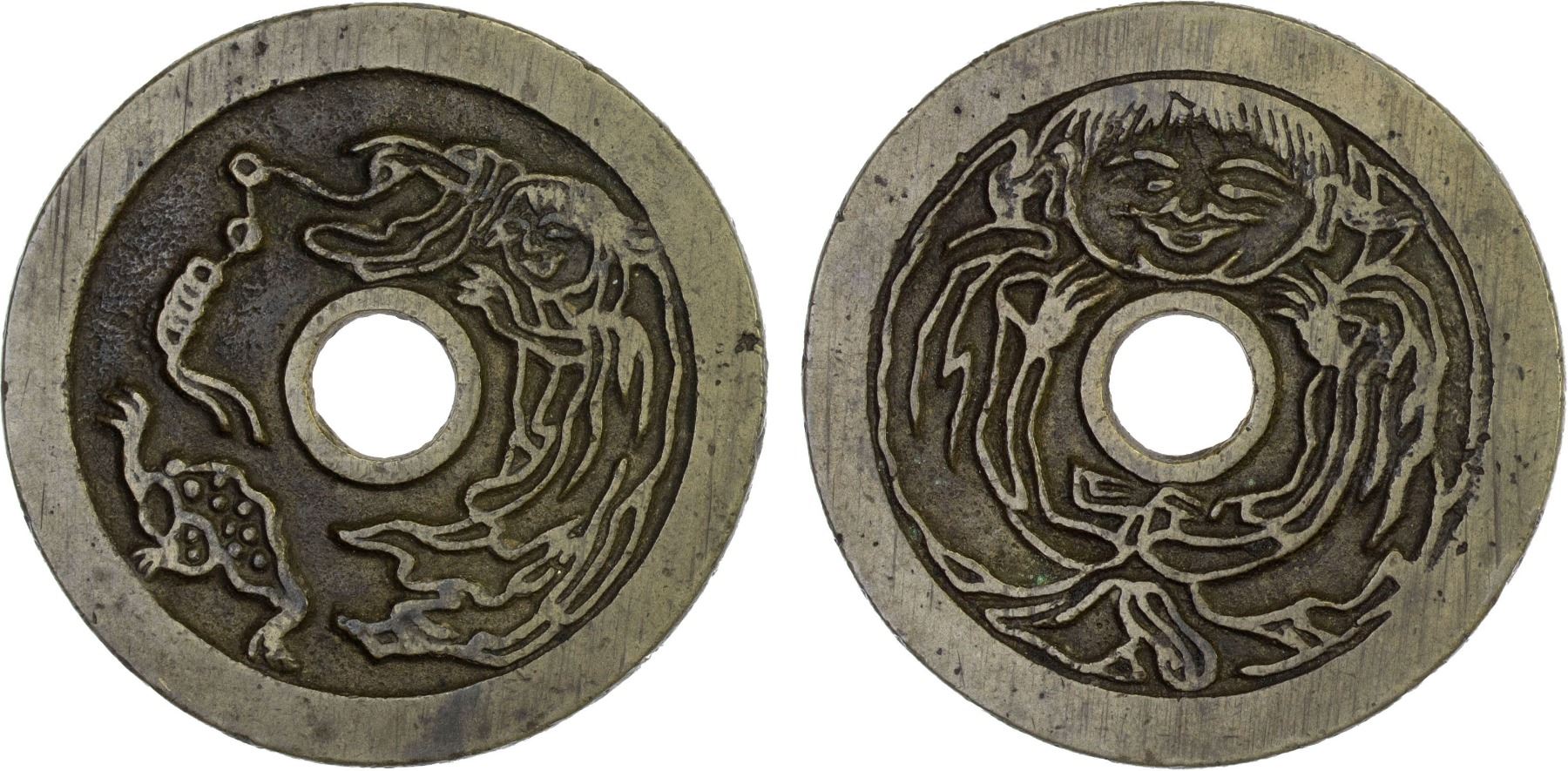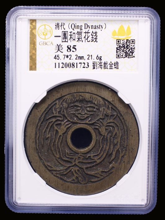 CHINA: AE charm, CCC-1802, 46mm, Liu Hai shown on the right waving a string of coins at the Three-Legged Toad below // facing portrait of Liu Hai, graded 85 by GBCA Grading Company, XF. It is possible that this is actually a portrait of the "Laughing Buddha," known as budai in Chinese and Hotei in Japanese. Budai was a Zen Buddhist monk who lived in China during the Liang Dynasty (502-557 AD) and is always shown smiling and laughing with a large pot belly symbolizing happiness, good luck and abundance. Likely cast in the Qing dynasty.