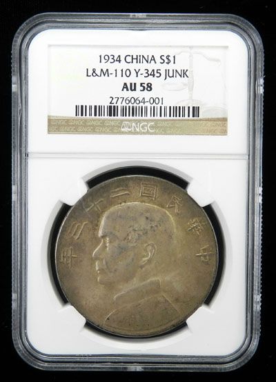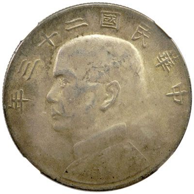 CHINA: AR dollar, year 23 (1934), Y-345, L&M-110, bust of Sun Yat Sen left, NGC graded AU58.