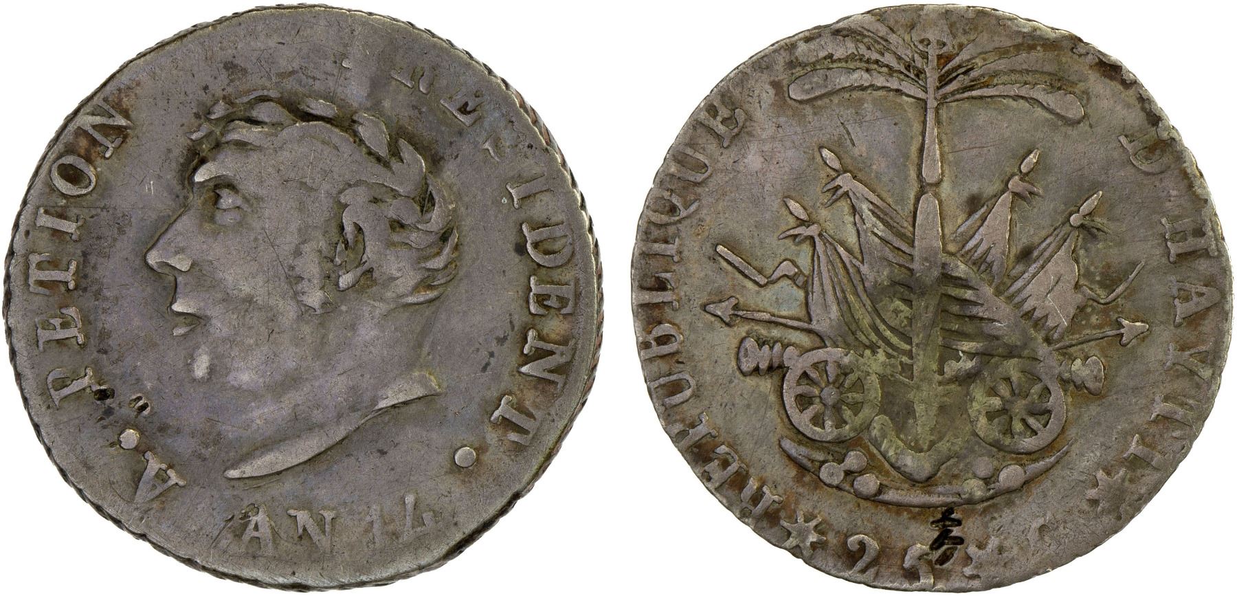 CHINA: CHOPMARKED COINS: Haiti: Republic, AR 25 centimes, AN 14 (1817), KM-15.1, bust of Alexandre Petion, one small Chinese merchant chopmark on obverse, in interesting collector's holder, very rare, F-VF.