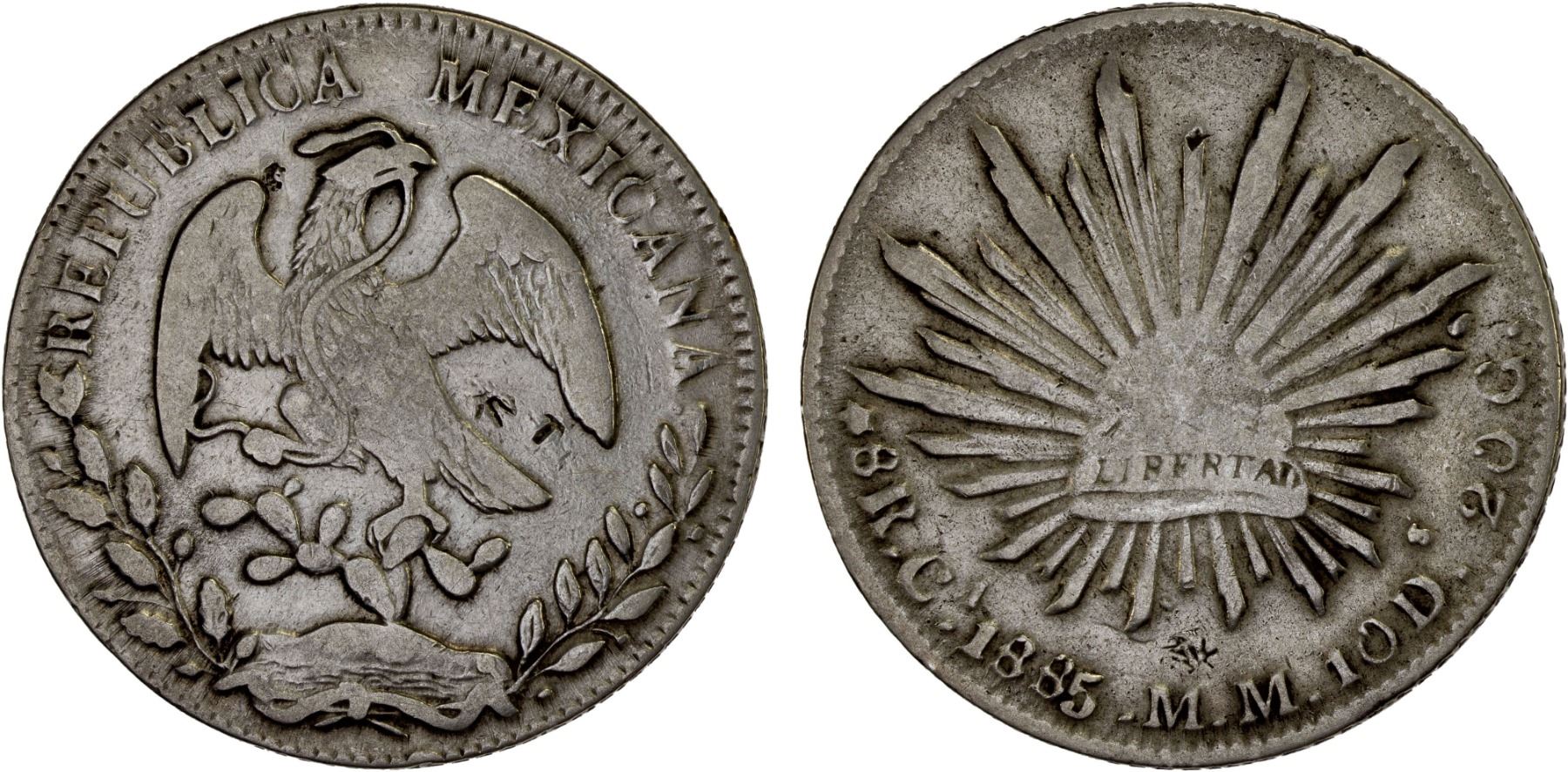 CHINA: CHOPMARKED COINS: MEXICO: Republic, AR 8 reales (26.55g), 1885-Ca, KM-377.2, assayer MM, a few small Chinese merchant chopmarks, Fine, ex Bob "Swamperbob" Gurney Collection.