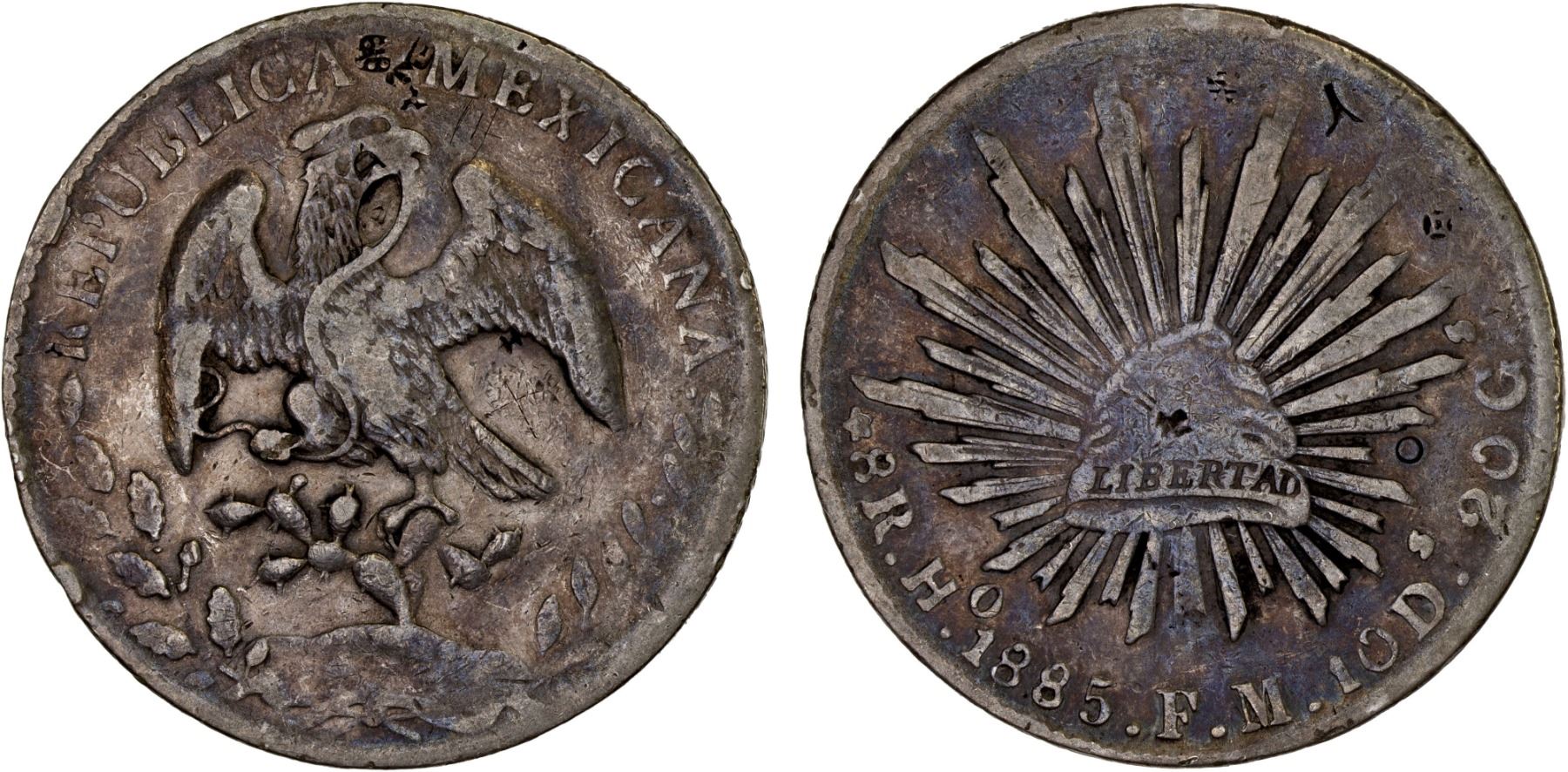 CHINA: CHOPMARKED COINS: MEXICO: Republic, AR 8 reales (26.60g), 1885-Ho, KM-377.9, assayer FM, small Chinese merchant chopmarks on both sides, a few small obverse scratches, uncommon host date, Fine, ex Bob "Swamperbob" Gurney Collection.
