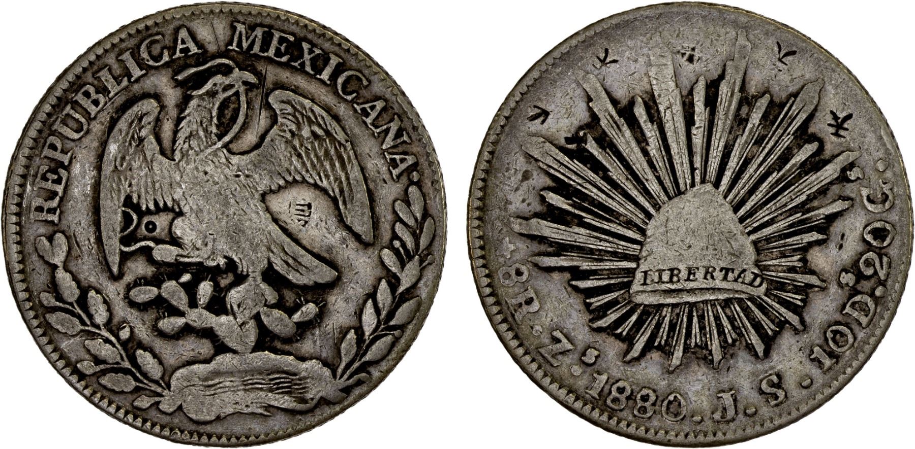 CHINA: CHOPMARKED COINS: MEXICO: Republic, AR 8 reales (26.95g), 1880-Zs, KM-377.13, assayer JS, with multiple small Chinese chopmarks on both sides, with a couple small obverse scratches, VF, ex Bob "Swamperbob" Gurney Collection.