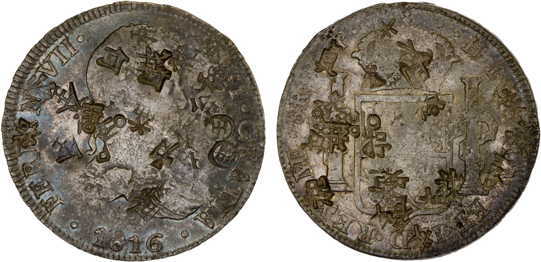 CHINA: CHOPMARKED COINS: PERU: Fernando VII, 1808-1821, AR 8 reales, 1816-LIMAE, KM-117.1, assayer JP, both sides with several large Chinese merchant chopmarks, light multicolored toning, VF-XF.