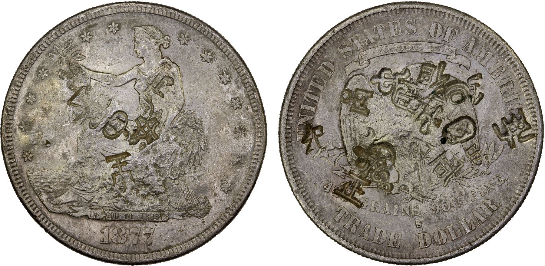 CHINA: CHOPMARKS:: UNITED STATES: AR trade dollar, 1877-S, KM-108, several Chinese merchant chopmarks on both sides, lightly lustrous, AU.