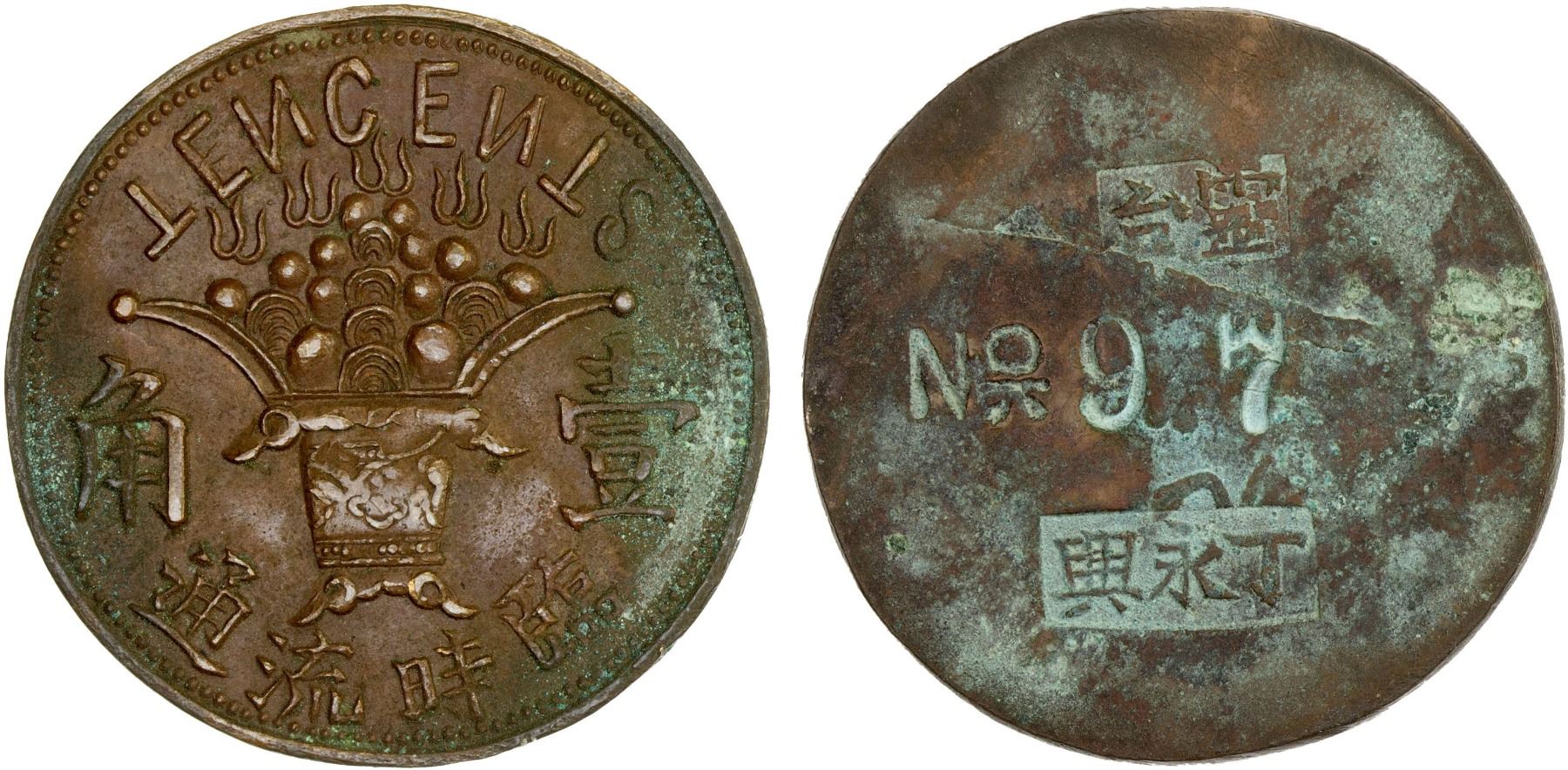 CHINA: Changzhou Tokens, AE 10 cents, ND (1939-41), issued by Ding Yongxing of Lingtai Village, treasure vessel flanked by denomination, retrograde TENCENTS above, linshi liutong ("temporary circulation") below // counterstamped village and business names with issue number 97 in the middle, some discoloration mainly on the reverse, otherwise decent brown patina, Choice XF. After the fall of Shanghai, the city of Changzhou fell to the rapidly advancing Japanese army on Nov. 29, 1937. After months of carnage and destruction, survivors returned to the city by the end of 1938 and encountered an acute shortage of coins due to the closure of the Central Mint in Shanghai. Local merchants thus began issuing copper tokens, as well as paper vouchers and tally sticks, in order to facilitate commercial transactions. Over the next two years, a plethora of varieties were issued by businesses across the city. This practice was finally put to an end by the Wang Jingwei regime and replaced with the Central Reserve Currency.