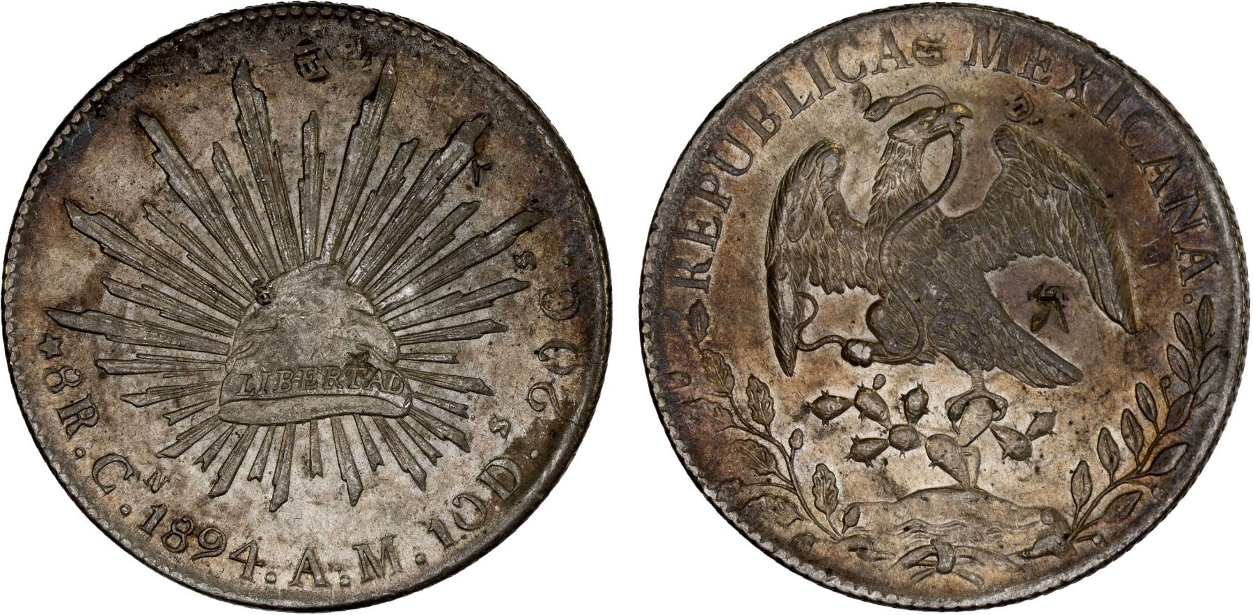 CHINA: Chopmarked Coins: Mexico: Republic, AR 8 reales, 1894-Cn, KM-377.3, assayer AM, multiple small Chinese merchant chopmarks on both sides, lightly toned, XF-AU.
