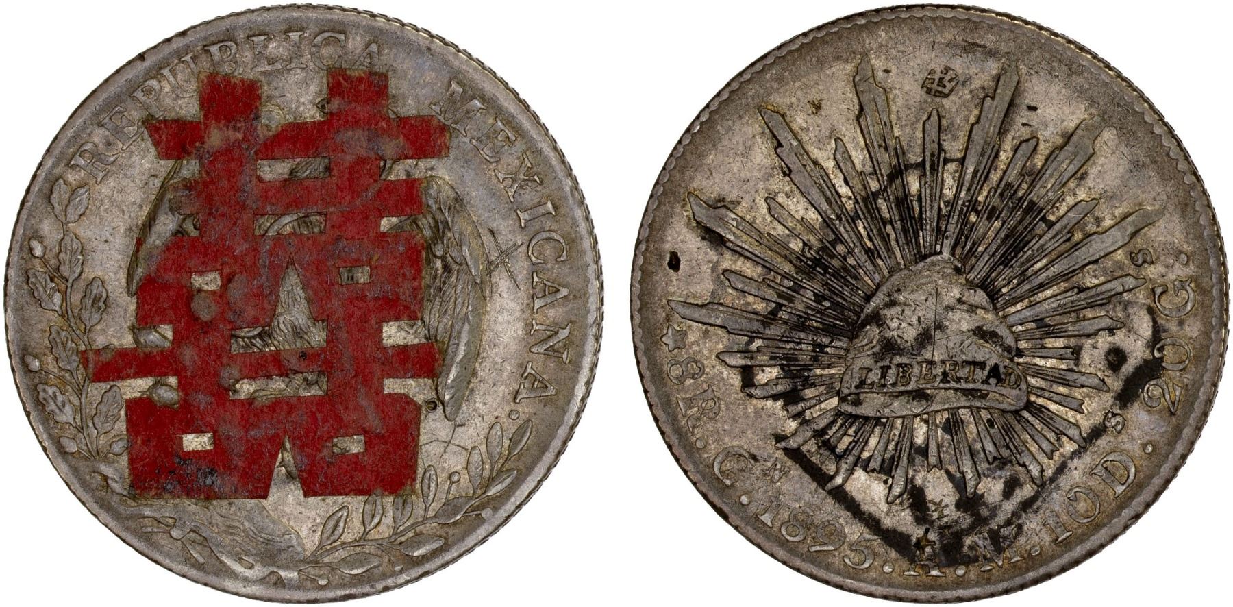CHINA: Chopmarked Coins: Mexico: Republic, AR 8 reales, 1895-Cn, KM-377.3, assayer AM, small Chinese merchant chopmarks, obverse with red paper chop of the Chinese character xi for double happiness, reverse ink chop, VF. The double happiness character is a traditional Chinese decoration commonly used in weddings.