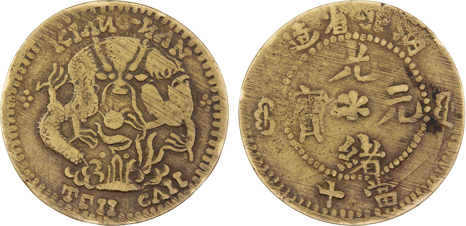 CHINA: Empire: Kuang Hsu, 1875-1908, brass 10 cash (5.96g), local imitation combining the Chinese side of Hupeh with the English side of Kiangnan, stylized design with barbarous English legend, a very interesting example, VF.