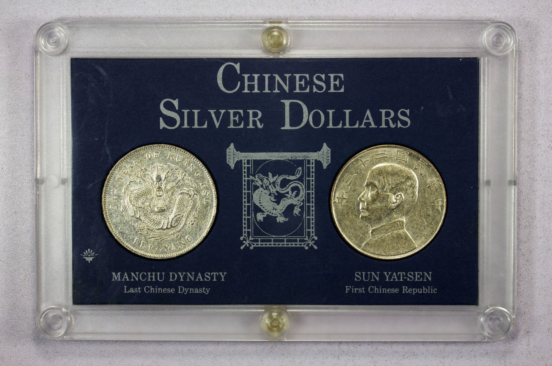 CHINA: Empire & Republic, SET of 2 silver dollars, includes CHIHLI: Kuang Hsu, 1875-1908, AR dollar, Peiyang Arsenal Mint, Tientsin, year 34 (1908), Y-73.2, L& M-465; and CHINA: Republic, AR dollar, year 23 (1934), Y-345, L&M-110, Sun Yat-sen, Chinese junk under sail, both coins cleaned and placed into custom plastic holder "Chinese Silver Dollars" by the Washington Mint, set of 2 coins.