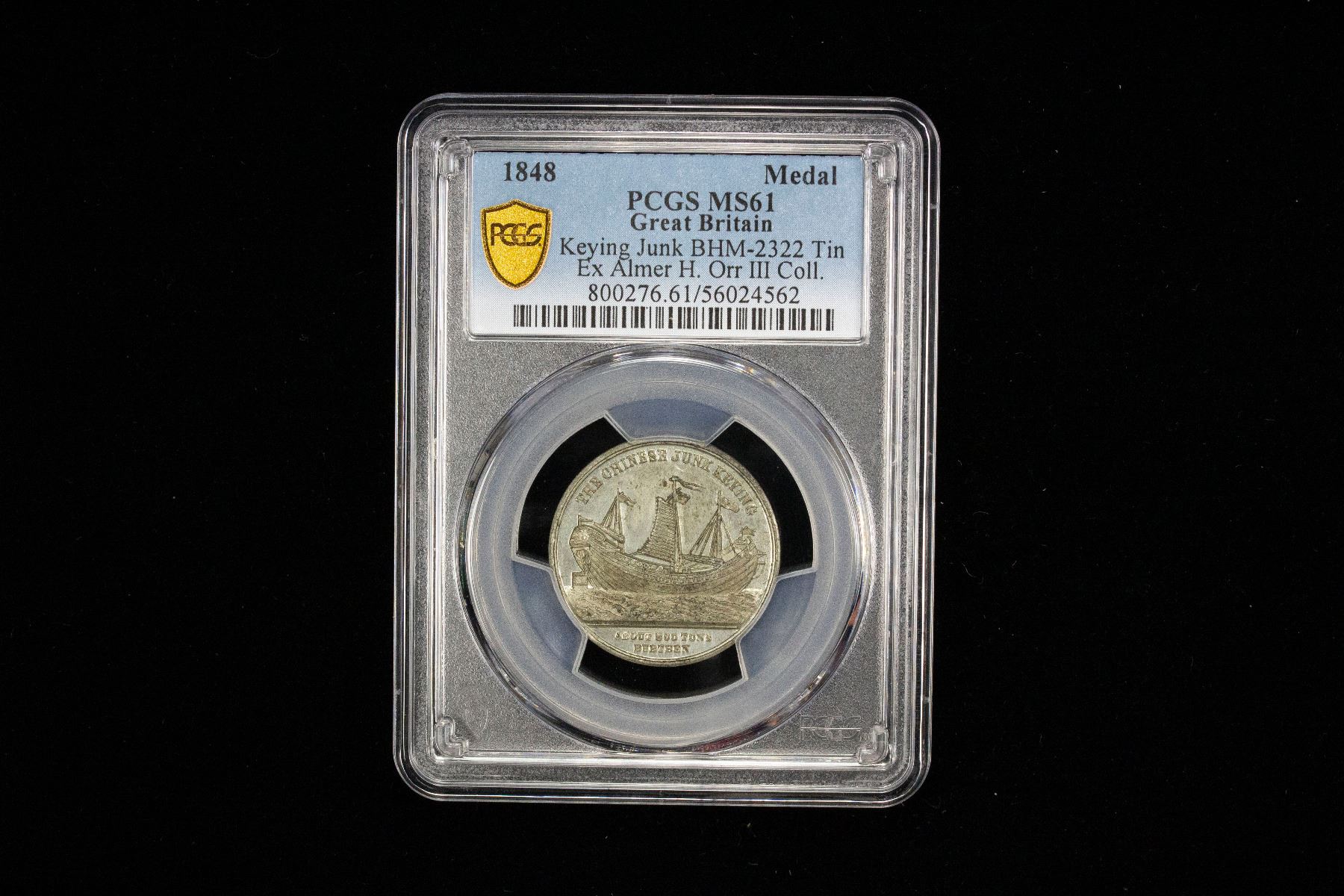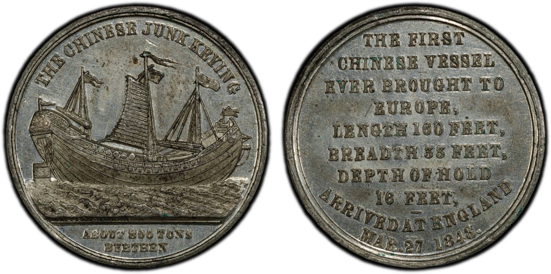 CHINA: Empire, white metal medal, 1848, BHM-2322, 27mm, medal by Messers Allen & Moore, "Voyage of the Junk Keying", starboard broadside view of the junk, mainsail set, THE CHINESE JUNK KEYING above, in exergue: ABOUT 800 TONS / BURTHEN // THE FIRST / CHINESE VESSEL / EVER BROUGHT TO / EUROPE, / LENGTH 160 FEET, / BREADTH 33 FEET, / DEPTH OF HOLD / 16 FEET, / ARRIVED AT ENGLAND / MAR. 27 1848, a wonderful example with proof like lustrous fields! PCGS graded MS64. This medal commemorated the first Chinese Junk boat to sail from China to England. The Keying was a three-masted, 800-ton Foochow Chinese trading junk which sailed from Hong Kong China in 1846 around the Cape of Good Hope first to New York and Boston in the United States and then to Britain in 1848.