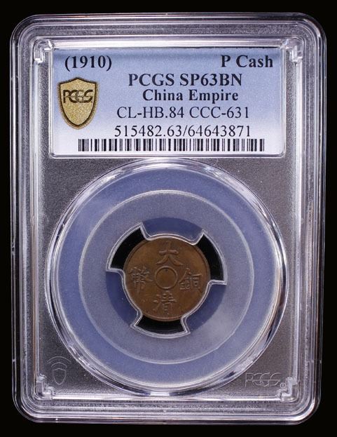 CHINA: Hsuan Tung, 1909-1911, AE cash, Central Mint, Tientsin, ND (1910), CL-HB.84, CCC-631, cf. KM-Pn267, a lovely brown lustrous specimen quality example of this exceedingly rare pattern type without central hole issued in the final years of the Qing Dynasty, PCGS graded Specimen 63 BN.