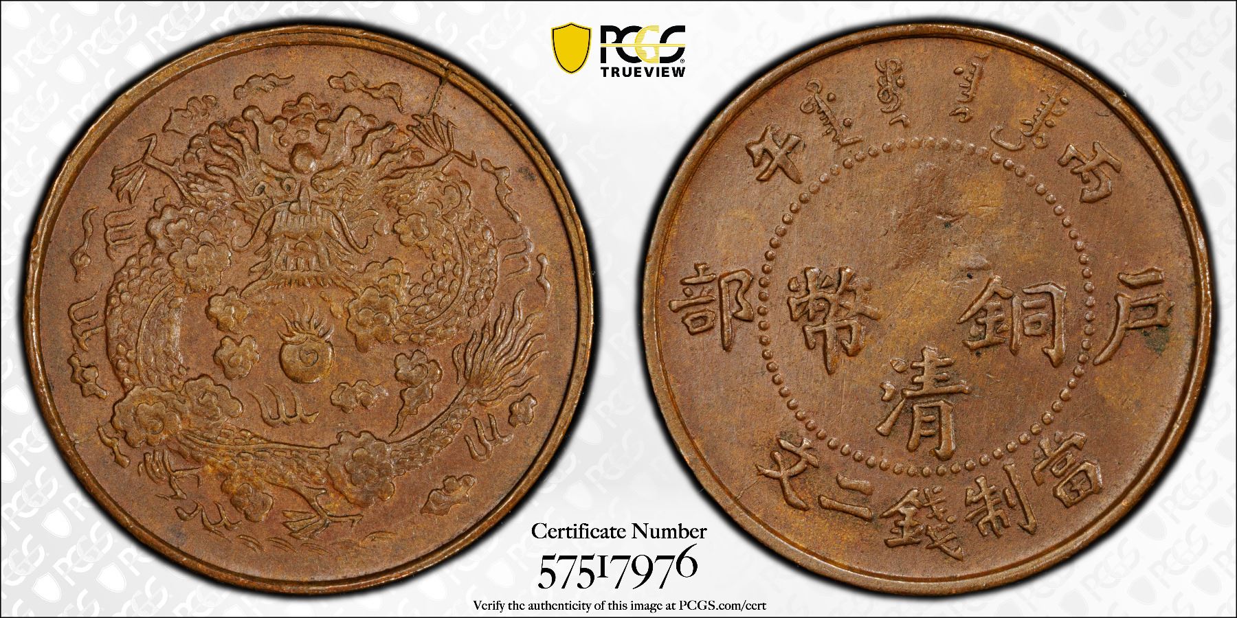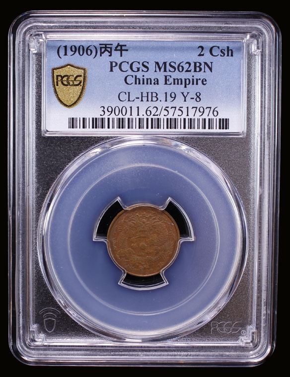 CHINA: Kuang Hsu, 1875-1908, AE 2 cash, Central Mint, Tientsin, CD1906, Y-8, CL-HB.19, a pleasing mint state example, PCGS graded MS62 BN.