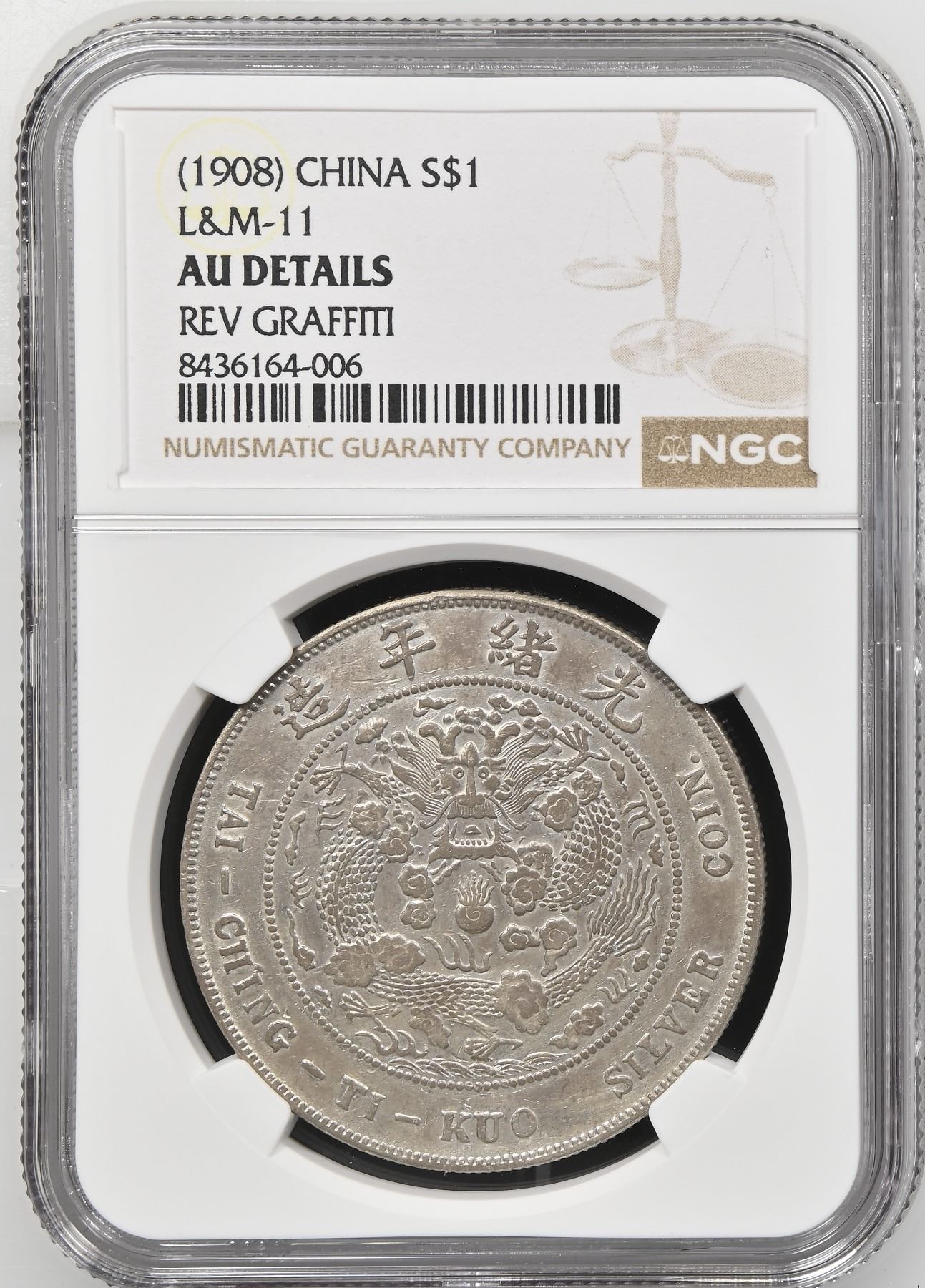 CHINA: Kuang Hsu, 1875-1908, AR dollar, Central Mint, Tientsin, ND (1908), Y-14, L&M-11, graffiti, NGC graded AU details.