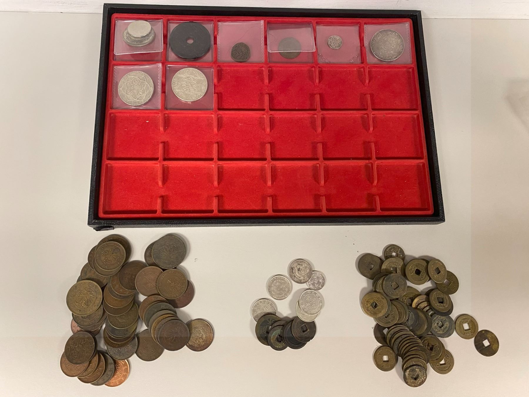 CHINA: LOT of 125 coins, including 45 machine-struck of various provinces (mostly AE 10 cash, also 5 in silver, and a Kirin 20 "cashes"), 62 cash coins (all Qing), a 44mm curse charm (most AEs in average circulated conditions, some better, silvers EF); plus 8 cash coins of Japan, 5 coins of Morocco (three AR 10 dirhams: AH1321-Pa, AH1329-Pa, AH1331-Pa, EF+ to near Unc conditions, a couple with light cleaning; an AR dirham and AE 5 mazunas), a Sufid AE pul (Khwarizm, AH767, decent VF, A-2065), and 3 other pieces; retail value $750, lot of 125 pieces.