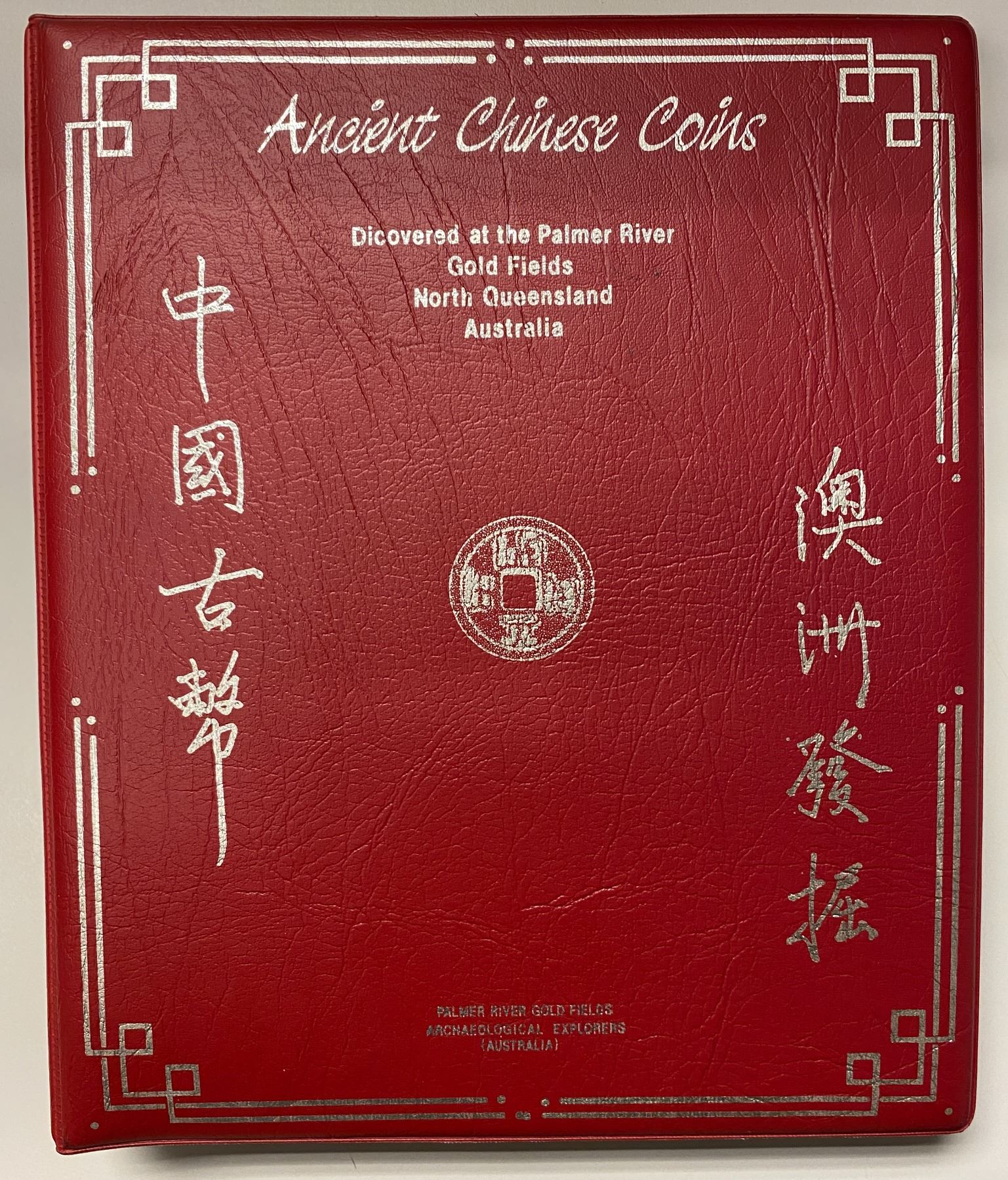 CHINA: LOT of 143 coins, large format album of Ancient Chinese Coins (cash coins) discovered at the Palmer River Goldfields North Queensland Australia described in a clip-lock bound volume with a red vinyl cover with silver printing, and described as the Courtenay Collection, all coins annotated with expansive text by Keith and Bibiana Courtney, Brisbane, in 1987. The collection contains 143 coins from the Tang Dynasty to the Qing Dynasty all described with Schjoth references. Average quality examples, numbered 25 of this 'Special Edition', very interesting! lot of 143 coins. This collection represents a selection from 32,000 coins in this hoard. The publication has a forward by Bredt Clayton (University of Queensland) and another by Francis Wildt-Paqvlu (Queensland College of Art). The publication includes photographs, text translations and a historical background to the Chinese goldminer's on the Palmer River. It is a hoard that is reported to have been found circa 1980 in an earthenware crock near Maytown on the Palmer River Goldfield, Queensland, Australia. This unique cache, which included two pieces of Warring States 'knife-money' dating from and coins of the Tang dynasty and later was sold off under the auspices of the Palmer River Historic Preservation Society. This publication is believed to be one of a number produced by this body for sale to interested collectors. With copies of letters from the Fitzwilliam Museum, The British Museum and the Heberden Coin Room at Oxford thanking Courtenay for gifts of similar albums.