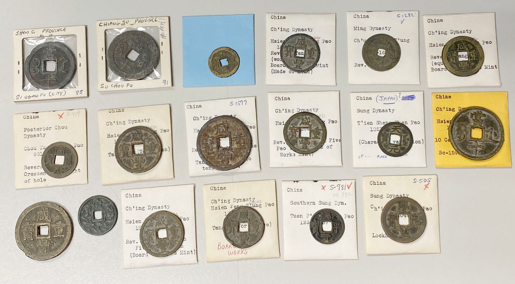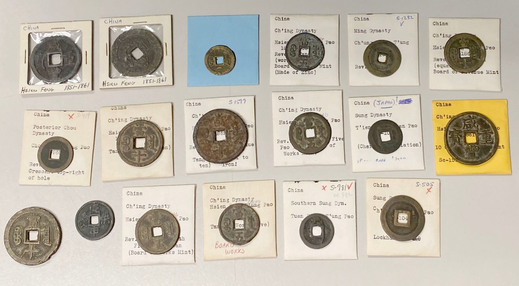 CHINA: LOT of 18 coins, collection of Chinese cash coins including; Posterior Chou (1), Northern Song (2), Southern Song (1), Ming (1), Qing Xian Feng 5 cash (4), 10 cash (7), Guang Xu scarce type 1 cash (1), charm (1), a nice group of mostly better type cash coins, average quality examples, retail value $300, lot of 18 coins.