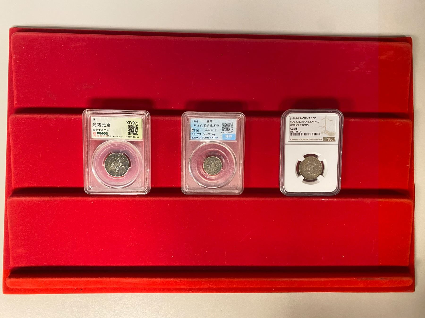 CHINA: LOT of 3 coins, includes Manchurian Provinces AR 20 cents ND (1914-15) L&M-4976 NGC graded AU-58, Hupeh AR 10 cents, ND (1895-1907), Y-124, L&M-185 CCGA graded XF-40 with chopmark, and AR 20 cents, ND (1895-1907), Y-125.1, L&M-184 WMGS graded XF(97), retail value $150, lot of 3 coins.