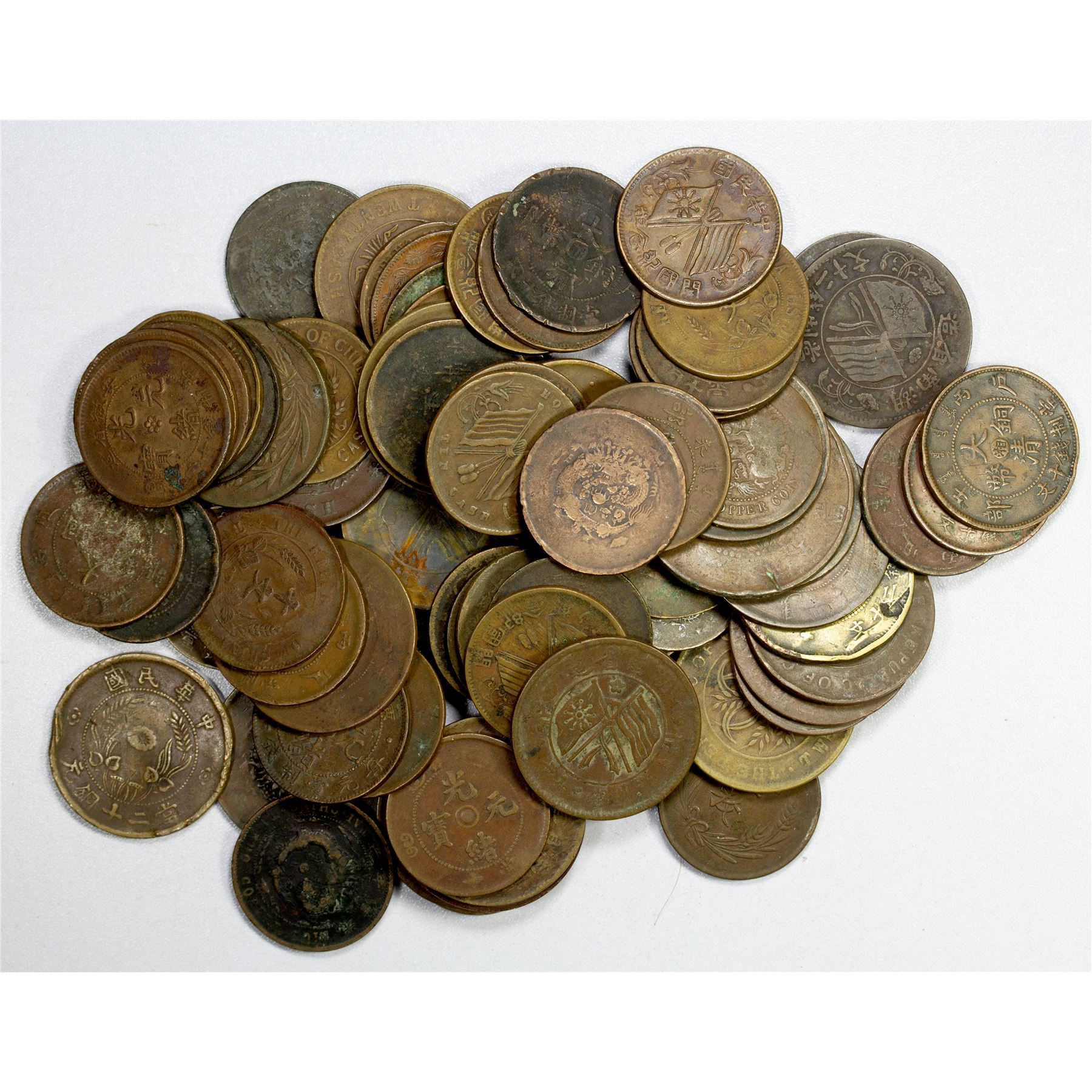 CHINA: LOT of 77 copper machine made coins, Imperial dragon type 10 cash coins (33), 20 cash coins (9), Republic of China mostly crossed flag types, 10 cash coins (20), 20 cash coins (14), 50 cash coins (1), mostly well circulated, retail value $300, lot of 77 coins.