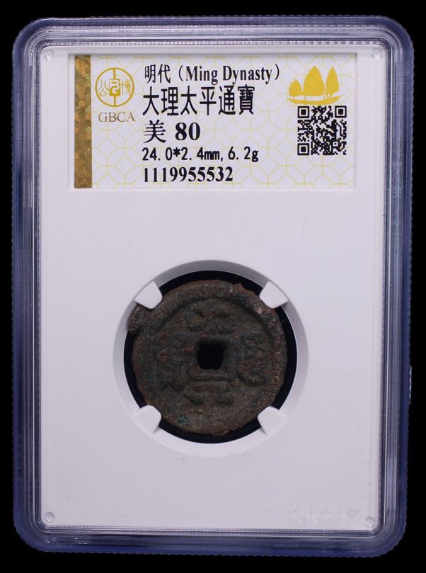 MING: Hong Zhi, 1488-1505, AE cash (6g), H-, tai ping tong bao, graded 80 by GBCA Grading Company, F-VF, ex Dr. Dirk Löer Collection. During the Hongzhi period (1488-1505), various tribes in the former territories of the Dali Kingdom (in present-day Yunnan and Guizhou) issued their own cash coins with the permission of the Ming government. These tribal issues are always crudely cast with a relatively thick flan and barbarous calligraphy, and the names on the coins were place names instead of reign titles according to Hartill. Several different inscriptional types are known so far.