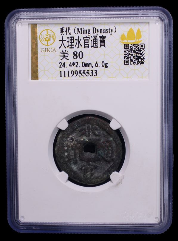 MING: Hong Zhi, 1488-1505, AE cash (6g), H-, shui guan tong bao, graded 80 by GBCA Grading Company, F-VF, ex Dr. Dirk Löer Collection. During the Hongzhi period (1488-1505), various tribes in the former territories of the Dali Kingdom (in present-day Yunnan and Guizhou) issued their own cash coins with the permission of the Ming government. These tribal issues are always crudely cast with a relatively thick flan and barbarous calligraphy, and the names on the coins were place names instead of reign titles according to Hartill. Several different inscriptional types are known so far.