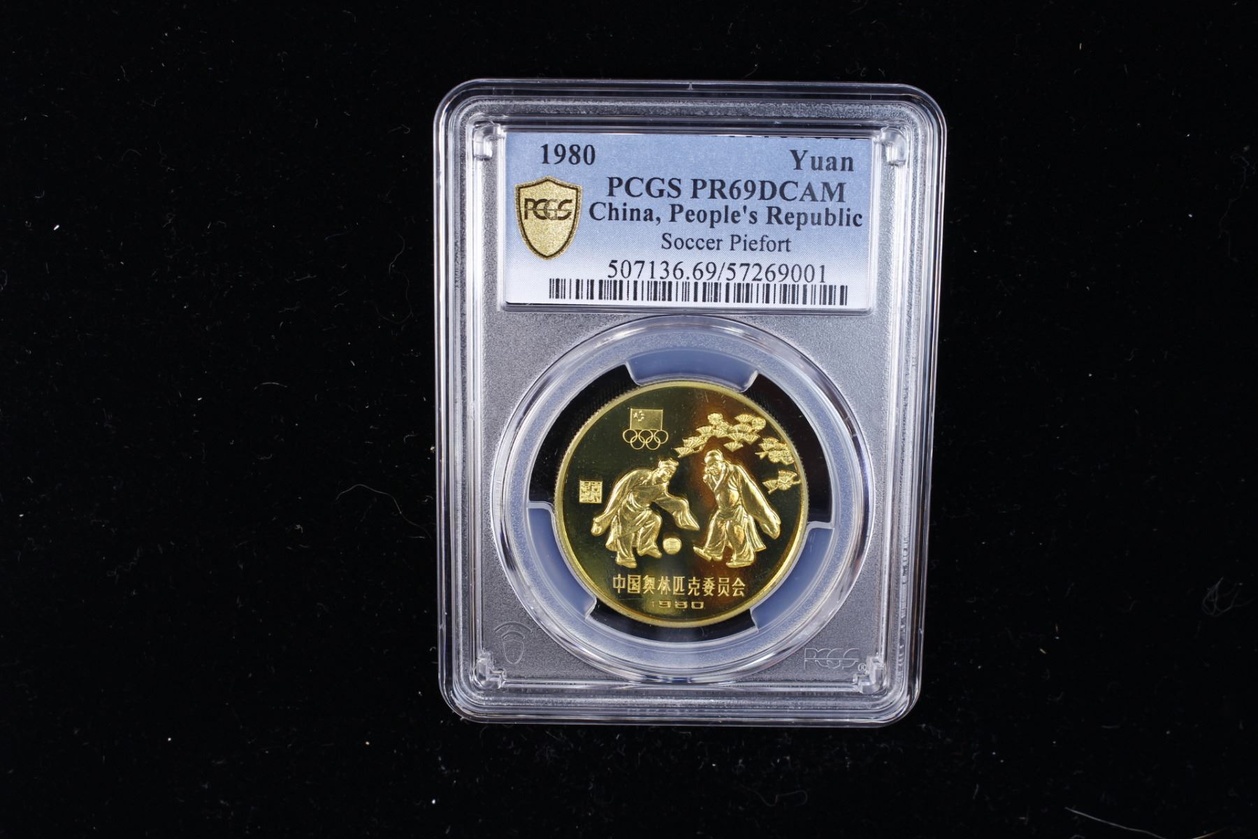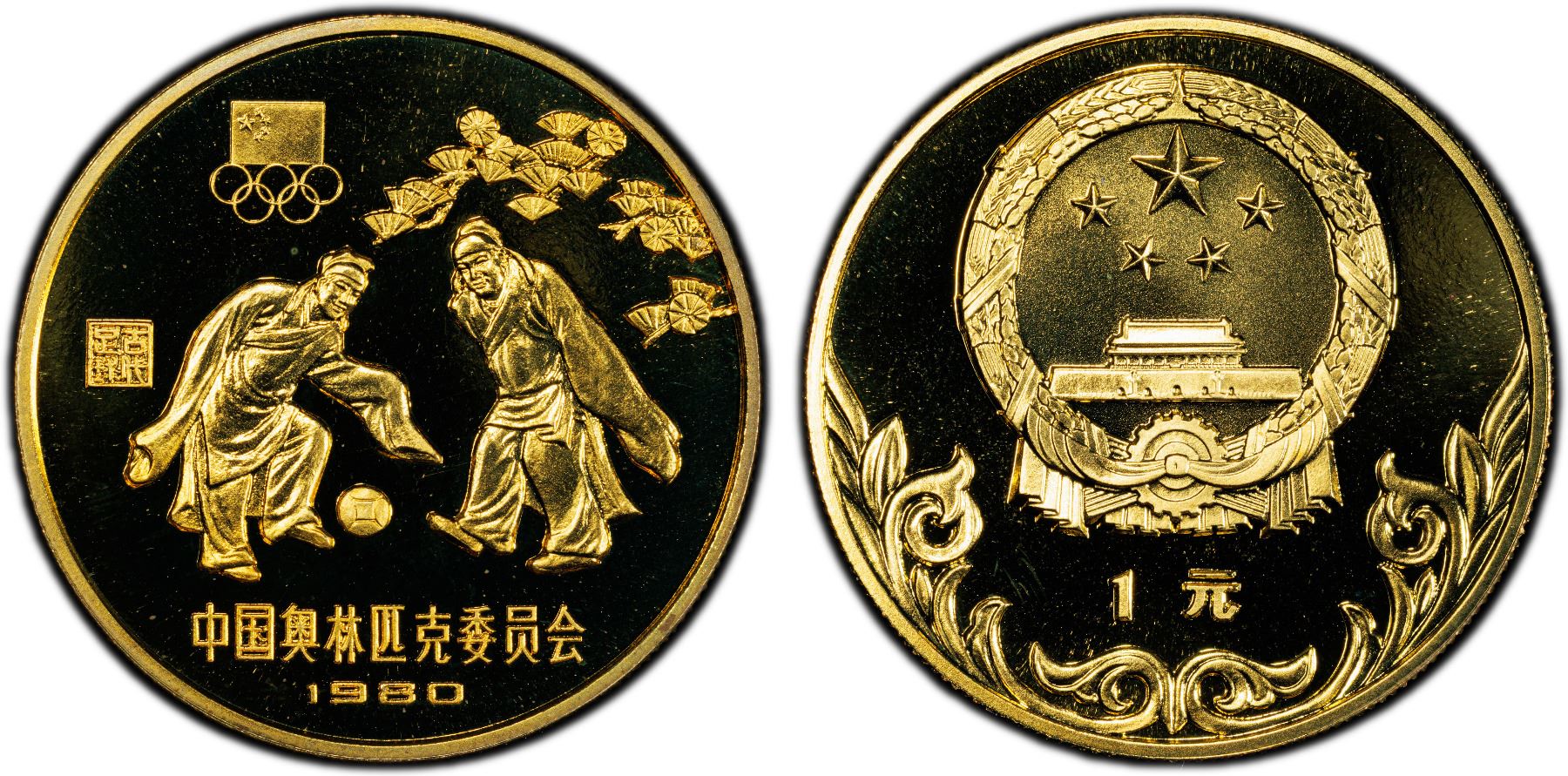CHINA (PEOPLE'S REPUBLIC): 1 yuan, 1980, KM-P6, struck in brass, Summer Olympic Games, Moscow - Soccer, piedfort (piéfort) issue, PCGS graded PF69 Cameo.