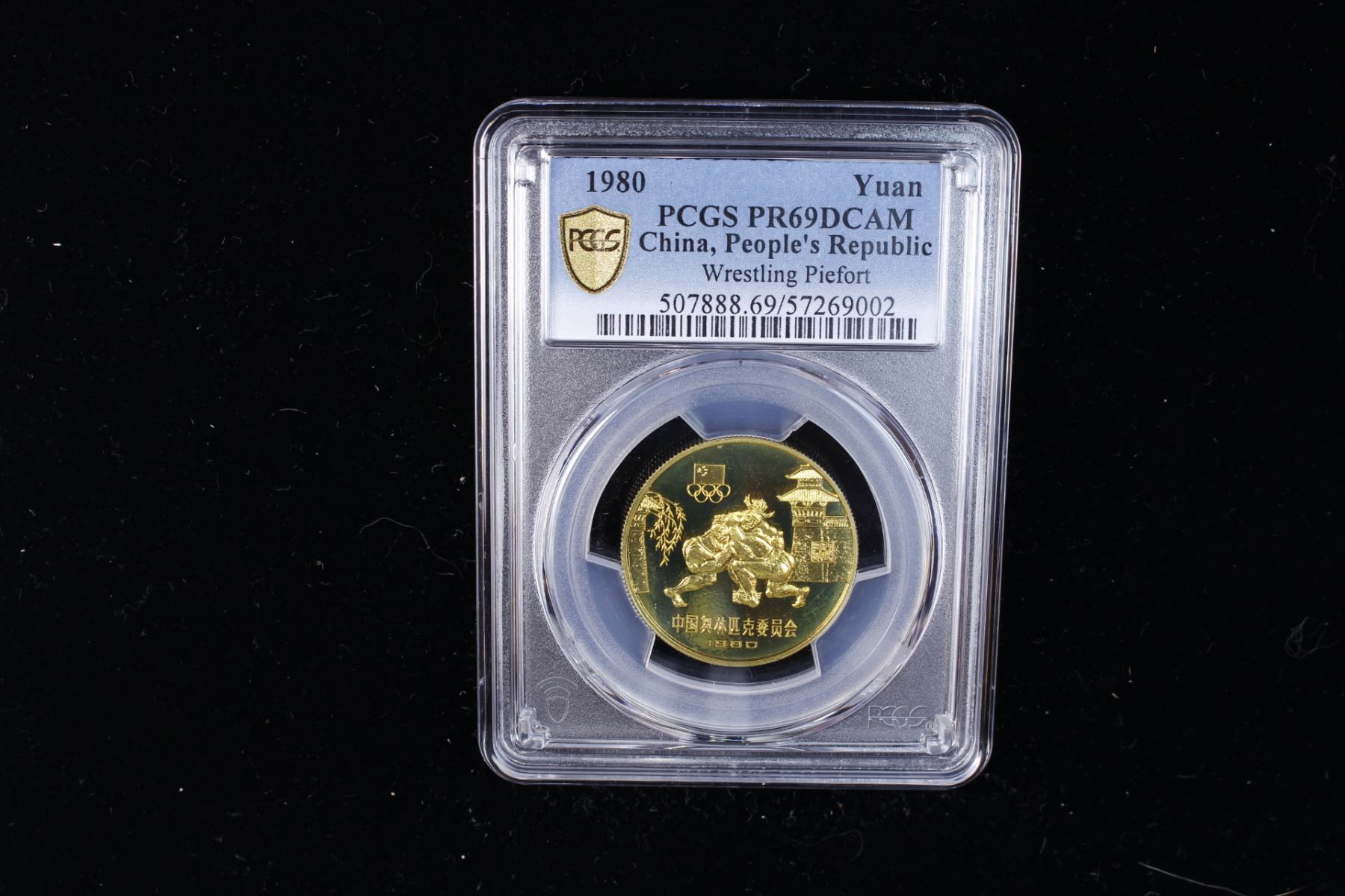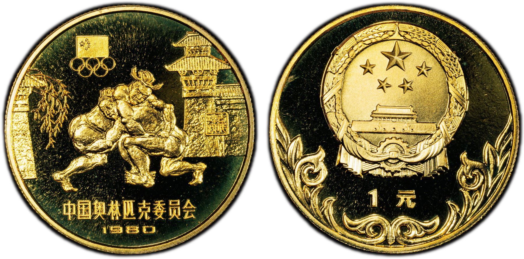 CHINA (PEOPLE'S REPUBLIC): 1 yuan, 1980, KM-P4, struck in brass, Summer Olympic Games, Moscow - Wrestling, piedfort (piéfort) issue, PCGS graded PF69 Cameo.