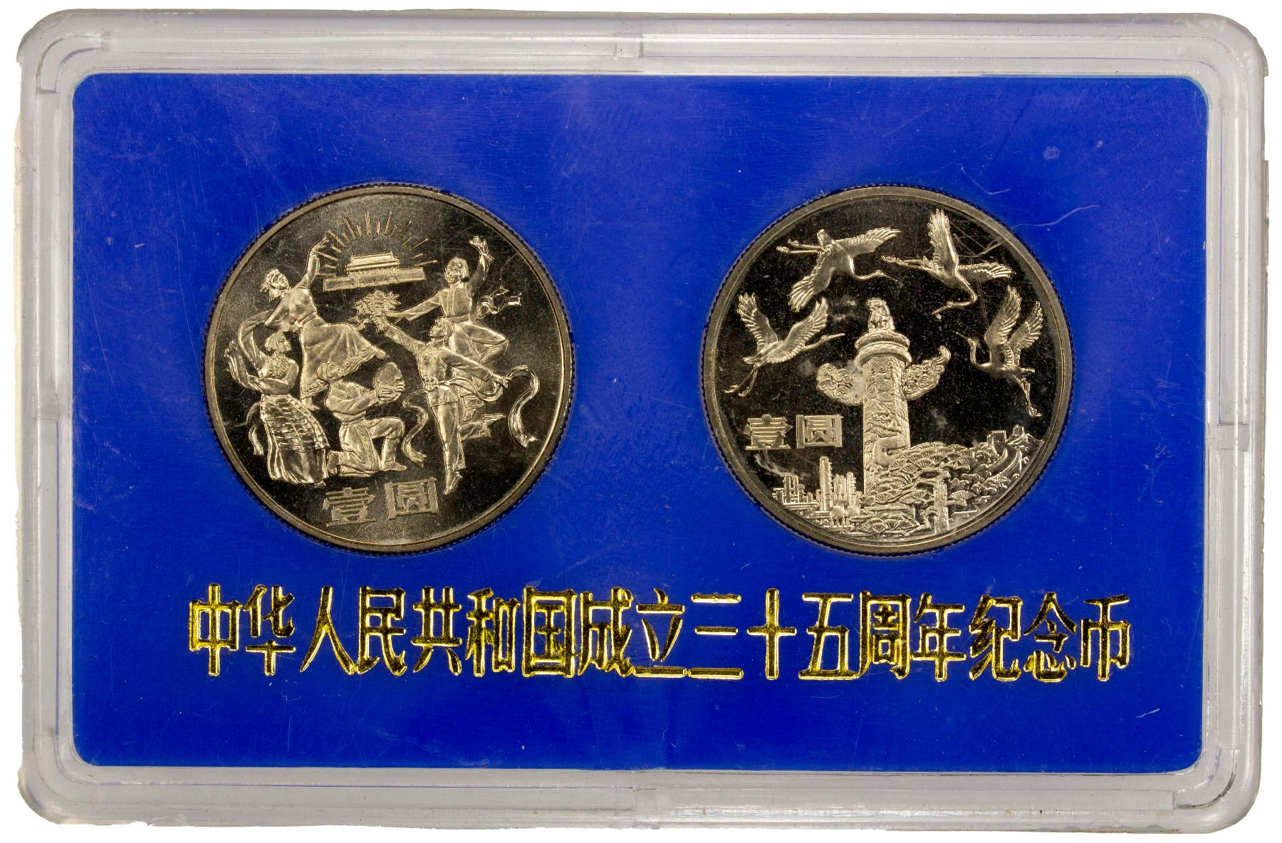 CHINA (PEOPLE'S REPUBLIC): 2-coin proof set, 1984, commemorating the 35th Anniversary of the People's Republic, including two 1 yuan coins (KM-105 dancers, KM-106 huabiao); both in brilliant proof condition and housed in original acrylic display case from the People's Bank of China; set of 2 coins.