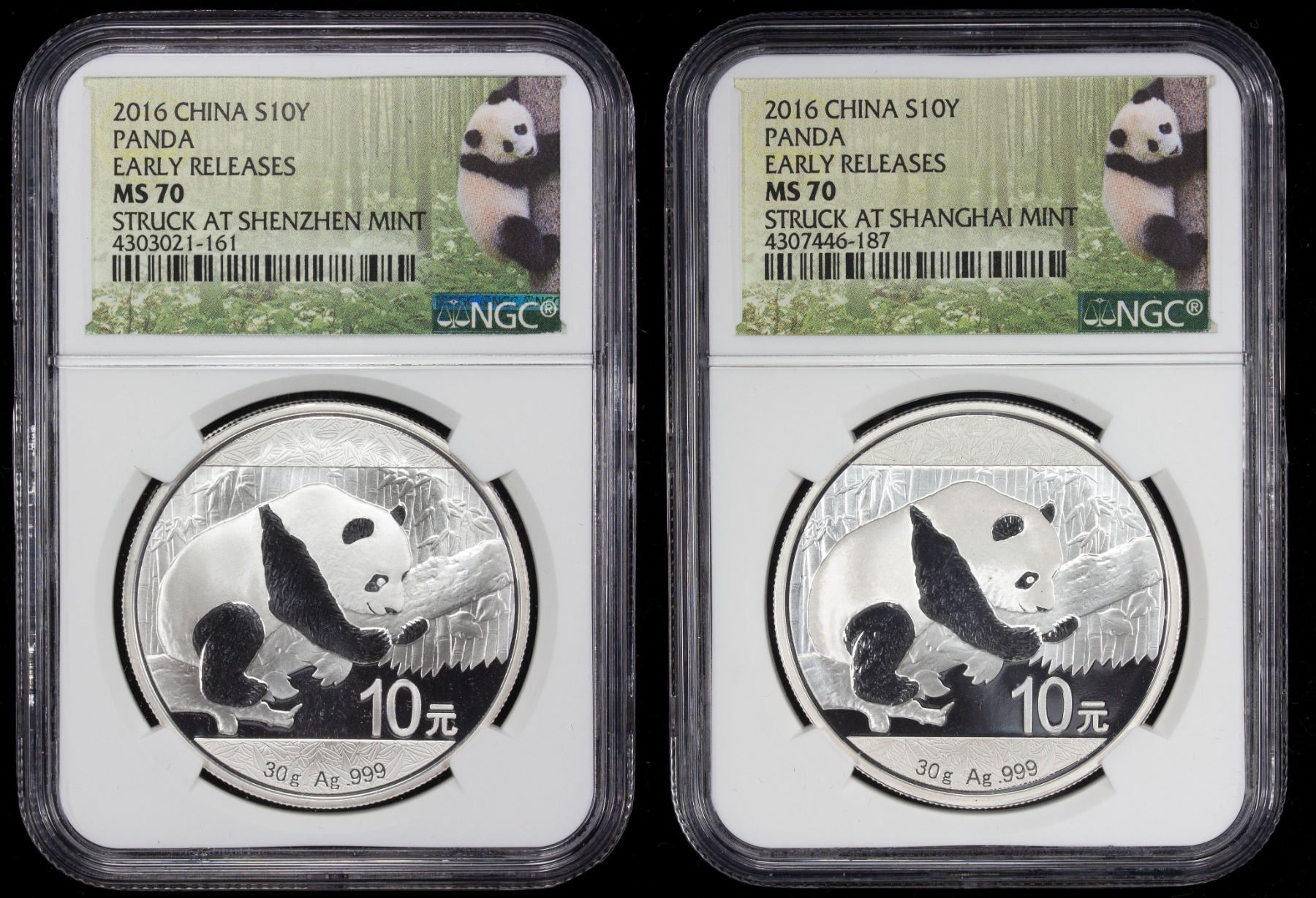 CHINA (PEOPLE'S REPUBLIC): 2-coin set, 2016, KM-2269, set of Silver Panda Series 10 yuan coins, one each from the Shanghai and Shenzhen mints, both graded MS-70 by NGC and set in a custom deluxe case, set of 2 coins.