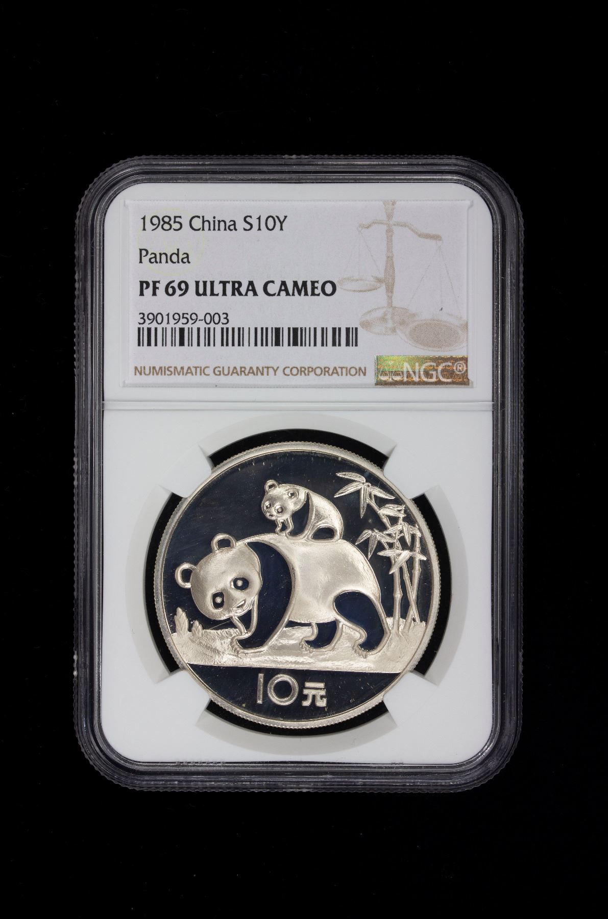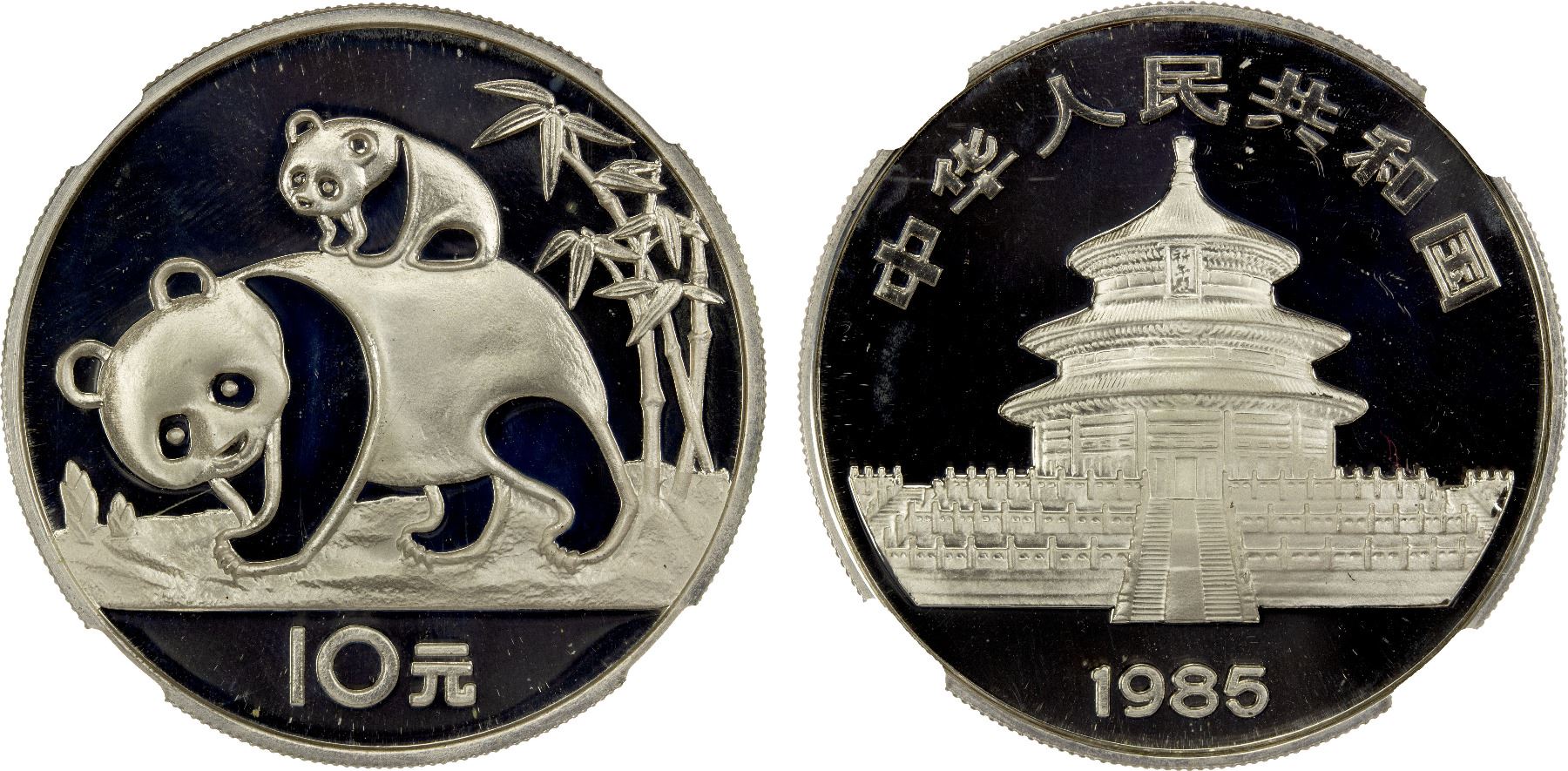 CHINA (PEOPLE'S REPUBLIC): AR 10 yuan, 1985, KM-114, PAN-27A, Silver Panda Series, NGC graded Proof 69 ULTRA CAMEO.