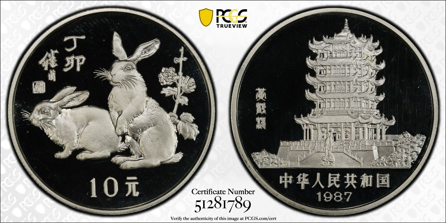 CHINA (PEOPLE'S REPUBLIC): AR 10 yuan, 1987, KM-169, Y-121, Chinese Zodiac Silver Series -Year of the Rabbit, with COA and original case issue, PCGS graded Proof 69 DCAM.
