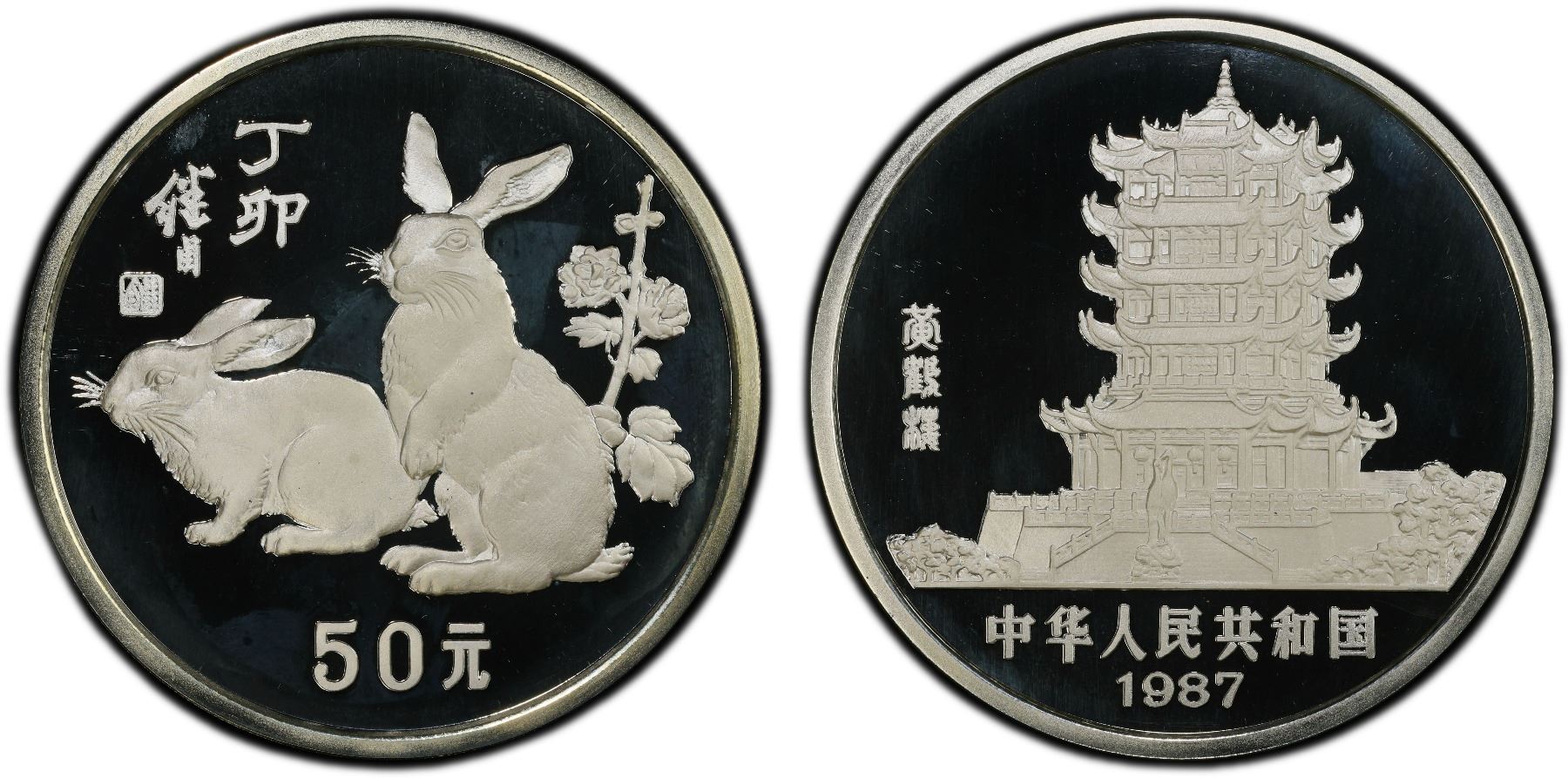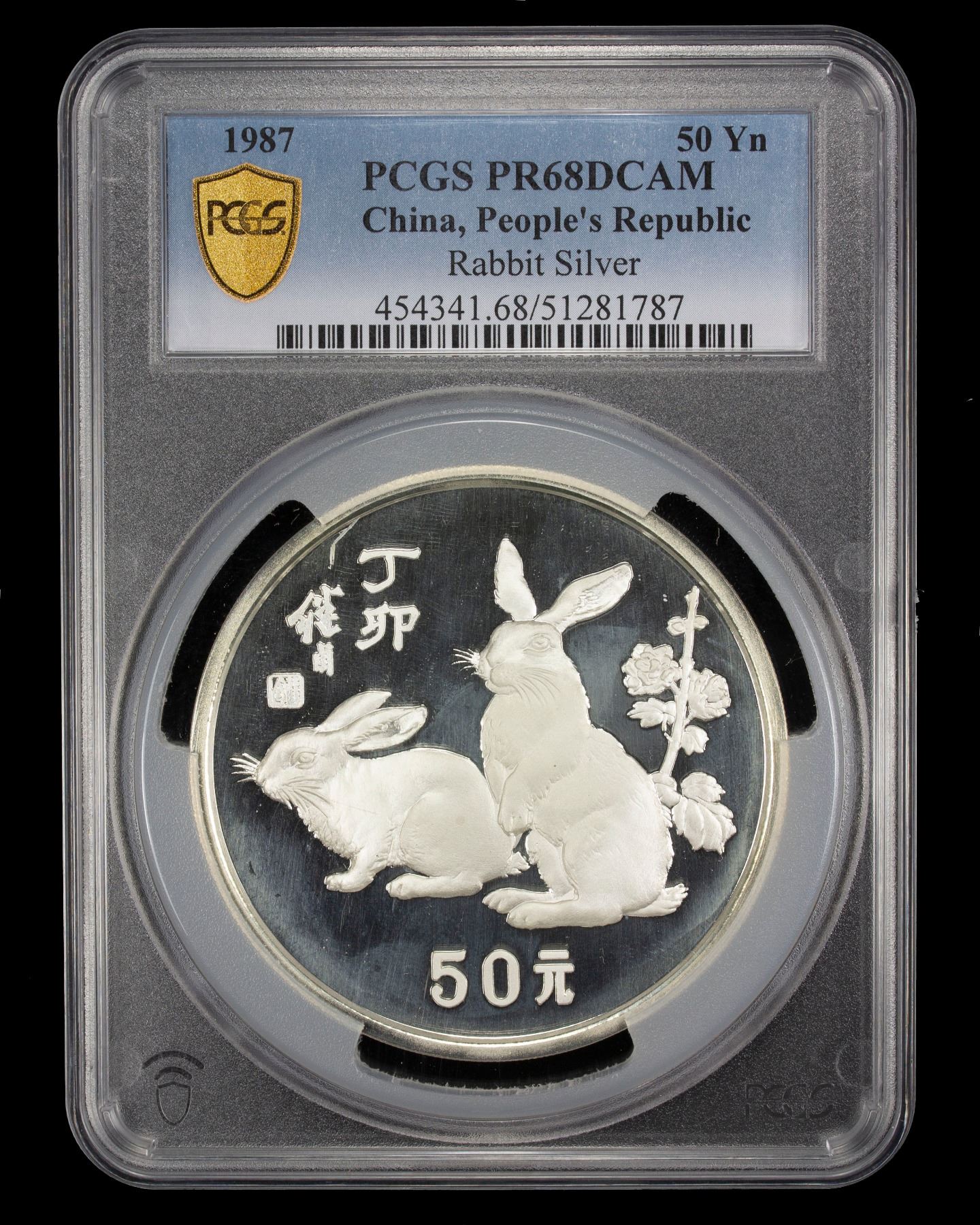 CHINA (PEOPLE'S REPUBLIC): AR 50 yuan, 1987, KM-170, Y-122, Chinese Zodiac Silver Series -Year of the Rabbit, 5 ounce pure silver, with COA and original case issue, PCGS graded Proof 68 CAM.