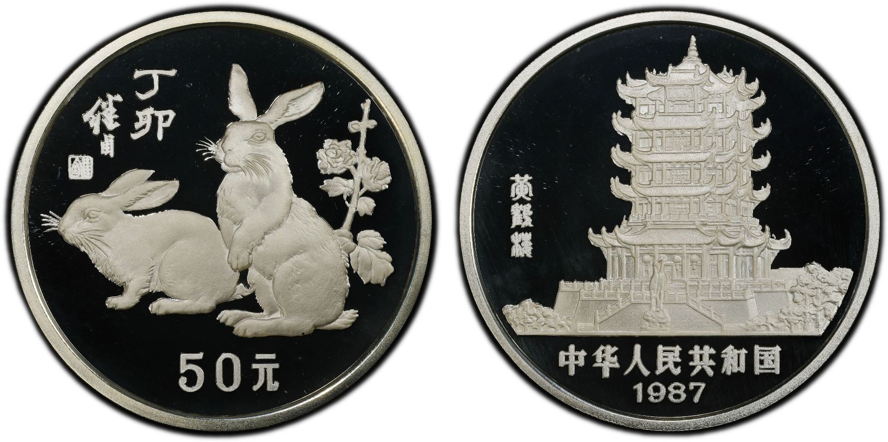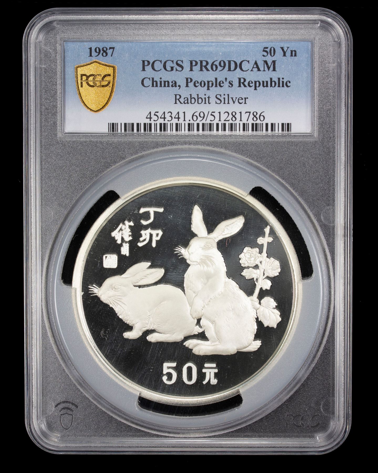 CHINA (PEOPLE'S REPUBLIC): AR 50 yuan, 1987, KM-170, Y-122, Chinese Zodiac Silver Series -Year of the Rabbit, 5 ounce pure silver with COA and original case issue, PCGS graded Proof 69 DCAM.