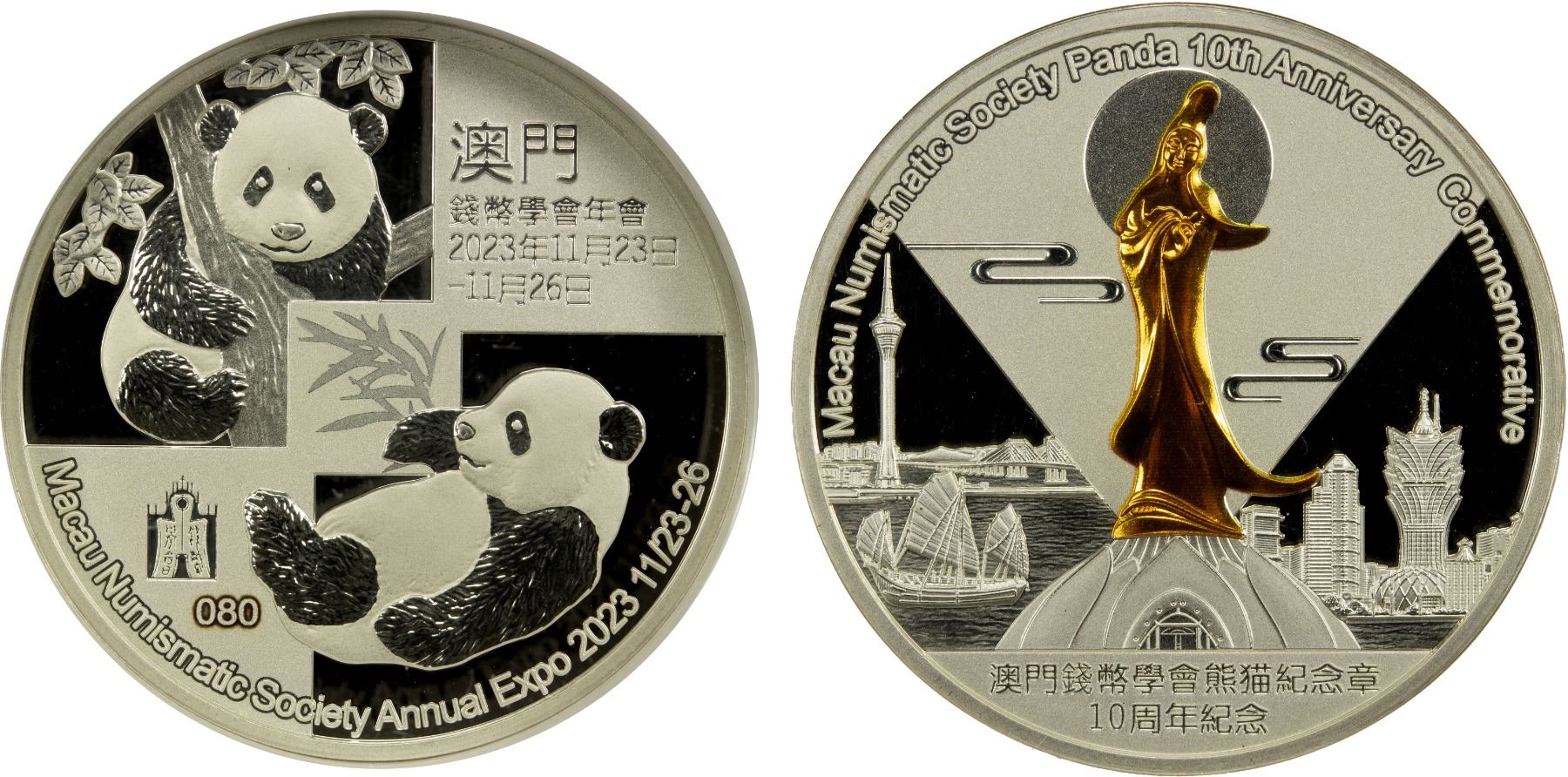 CHINA (PEOPLE'S REPUBLIC): AR medal, 2023, 31mm unsigned selectively gilt silver medal for the Macau Numismatic Society Annual Expo, pandas at upper left and lower right with Chinese legend in 4 lines at upper right, and spade money privy mark and "080" (medal number) at lower left, "Macau Numismatic Society Annual Expo 2023 11/23-26" at bottom // female figure selectively gilt on top of building with junk boat at left and skyline at right, with "Macau Numismatic Society Panda 10th Anniversary Commemorative" around and Chinese legend in two lines in exergue, with COA, with special hand-signed label picturing the designer, Yu Min, no box, NGC graded Proof 70 Ultra Cameo.