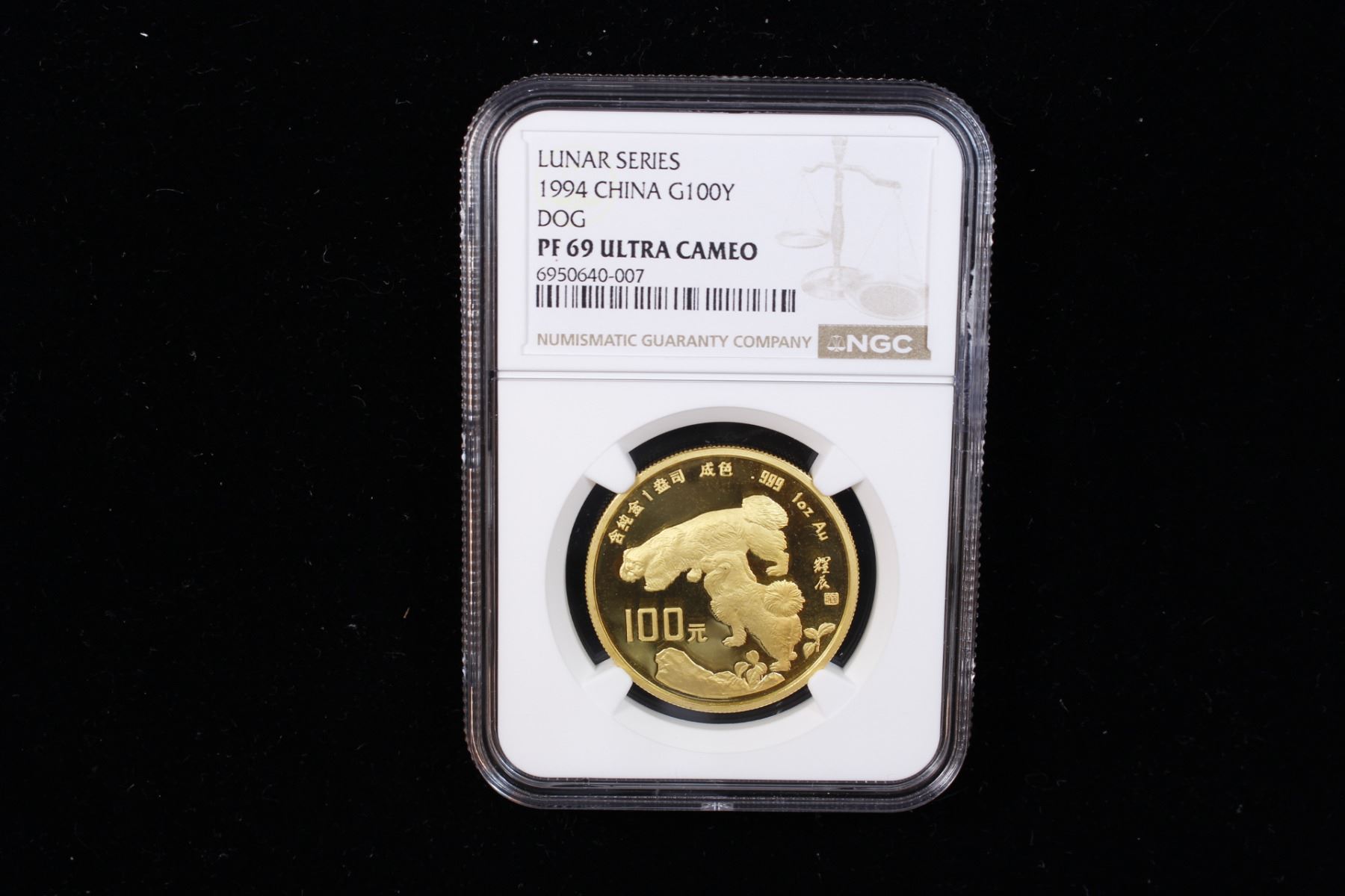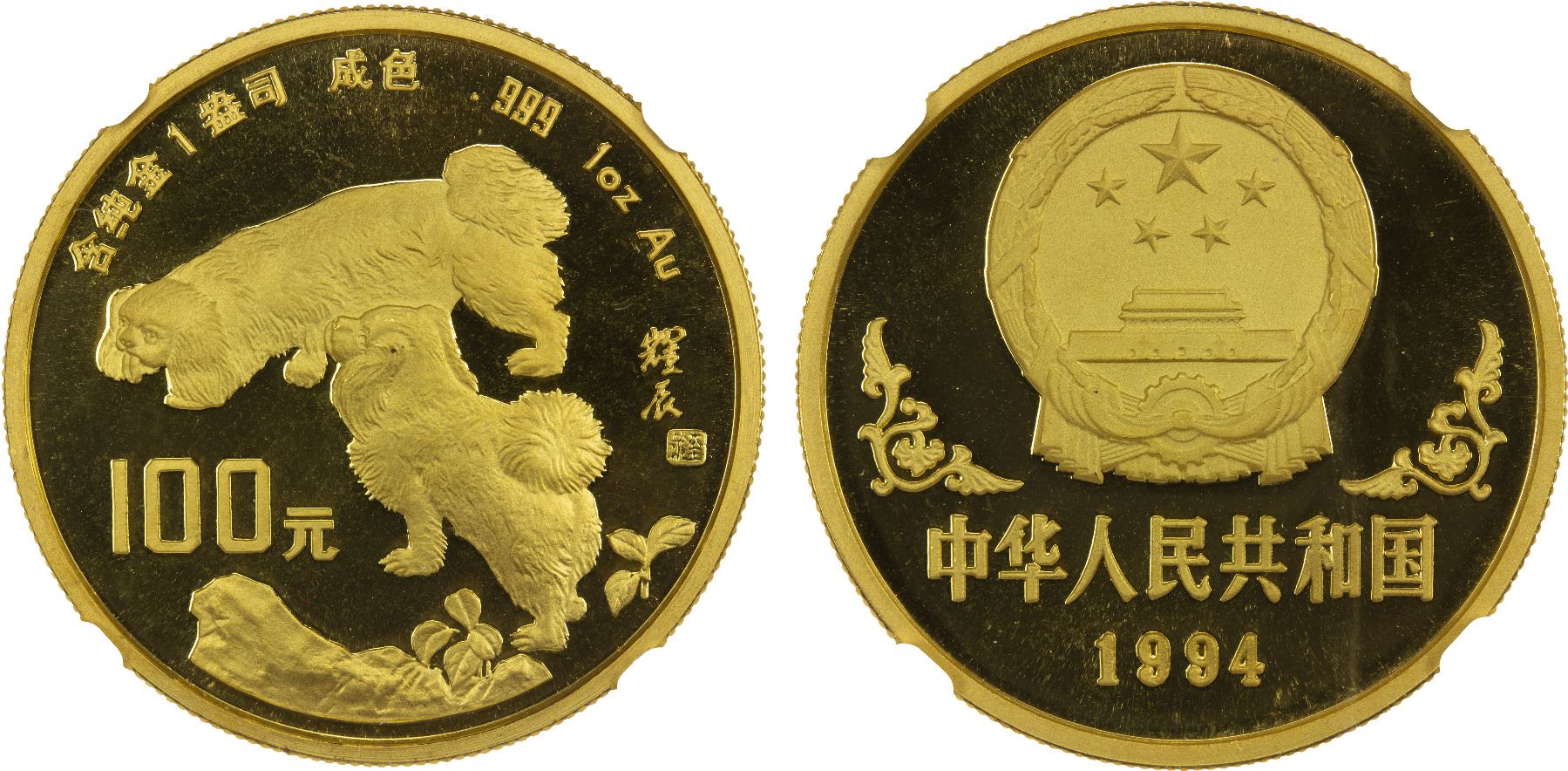 CHINA (PEOPLE'S REPUBLIC): AV 100 yuan, 1994, KM-648, Chinese Zodiac Series - Year of the Dog, contains one troy ounce of pure cold, NGC graded Proof 69 ULTRA CAMEO.