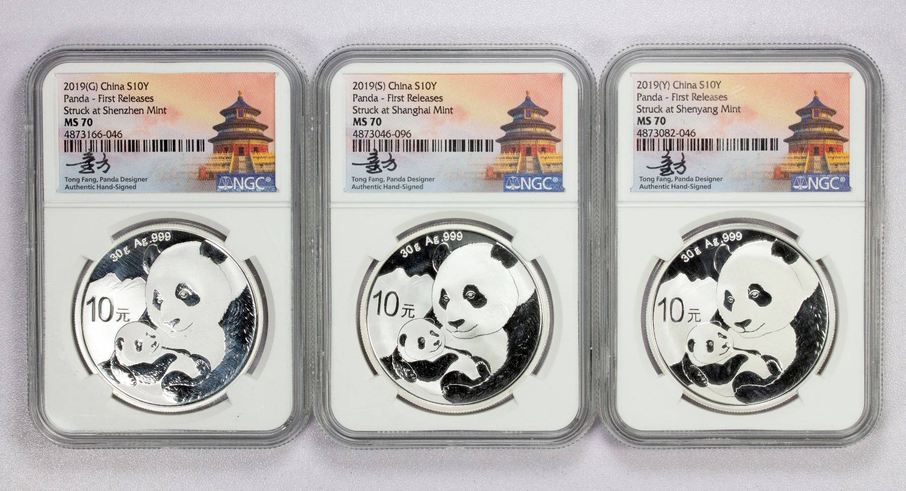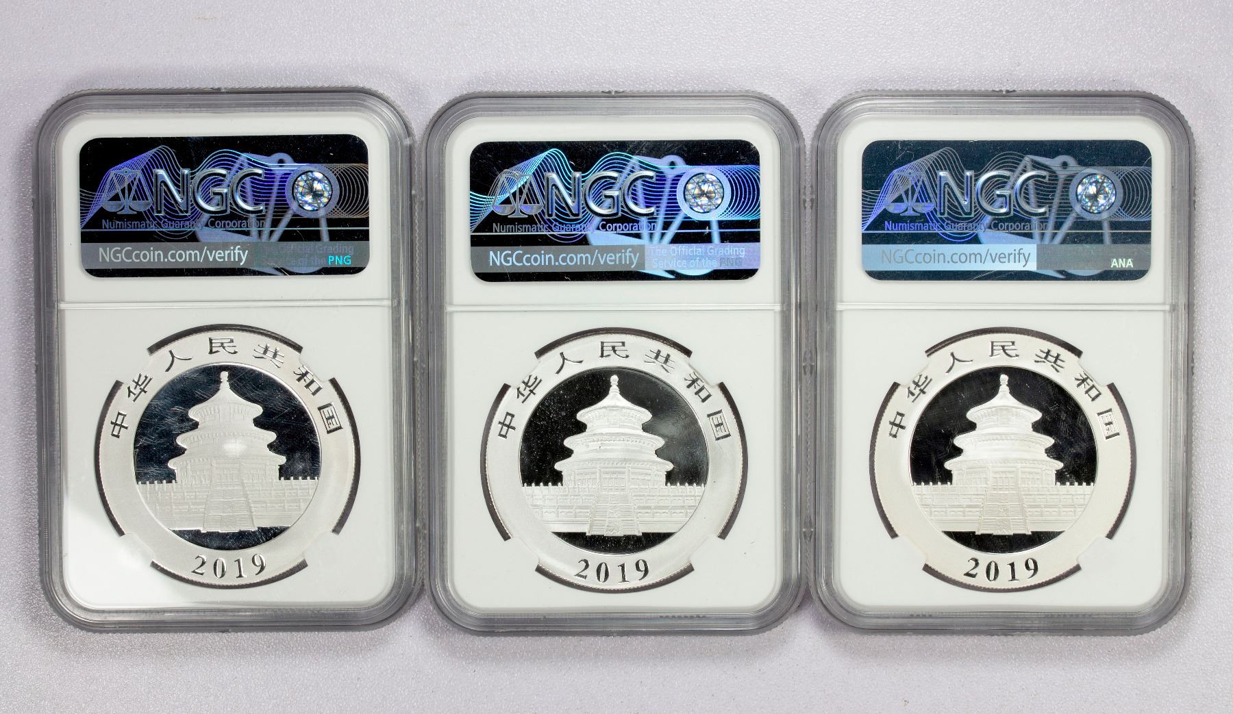 CHINA (PEOPLE'S REPUBLIC): LOT of 3 coins, 2019-Y Panda Series 30g pure silver 10 yuan coins, all graded by NGC as MS-70, struck at the Shenyang Mint, retail value $175, lot of 3 coins.