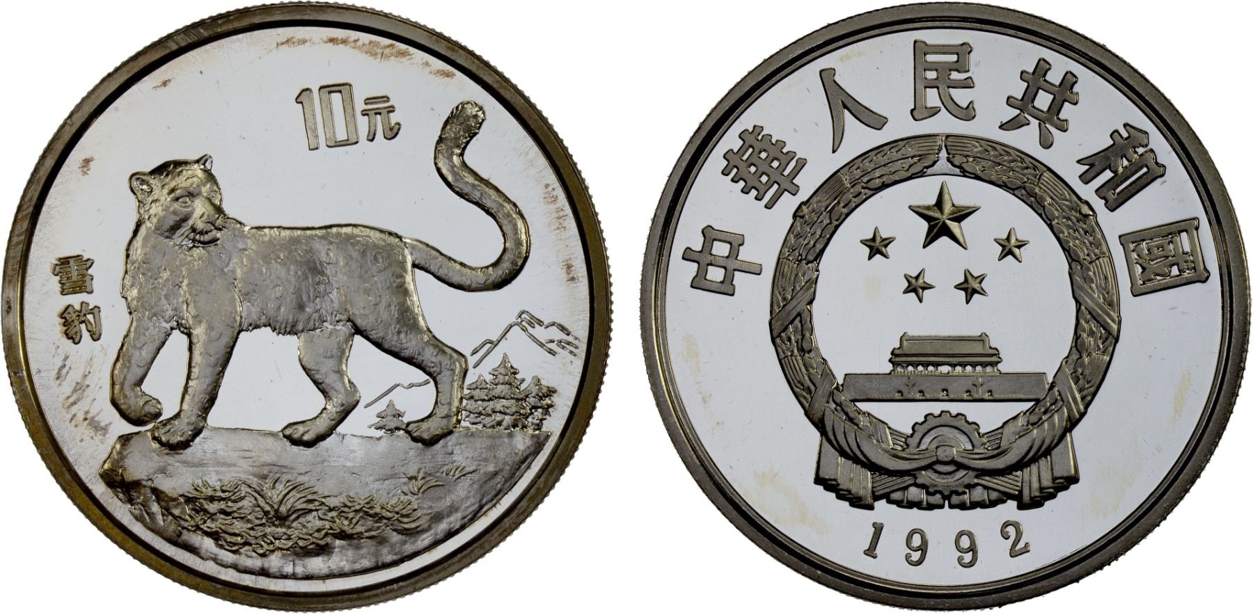 CHINA: People's Republic, AR 10 yuan, 1992, KM-455, Y-584, Snow Leopard, Proof.