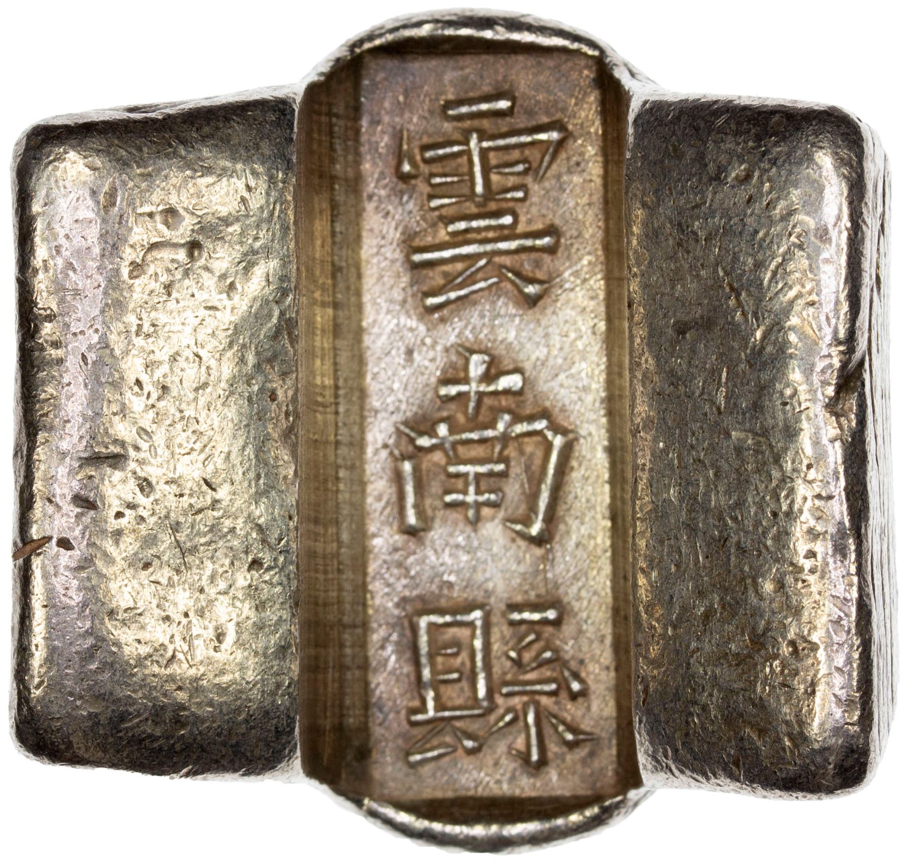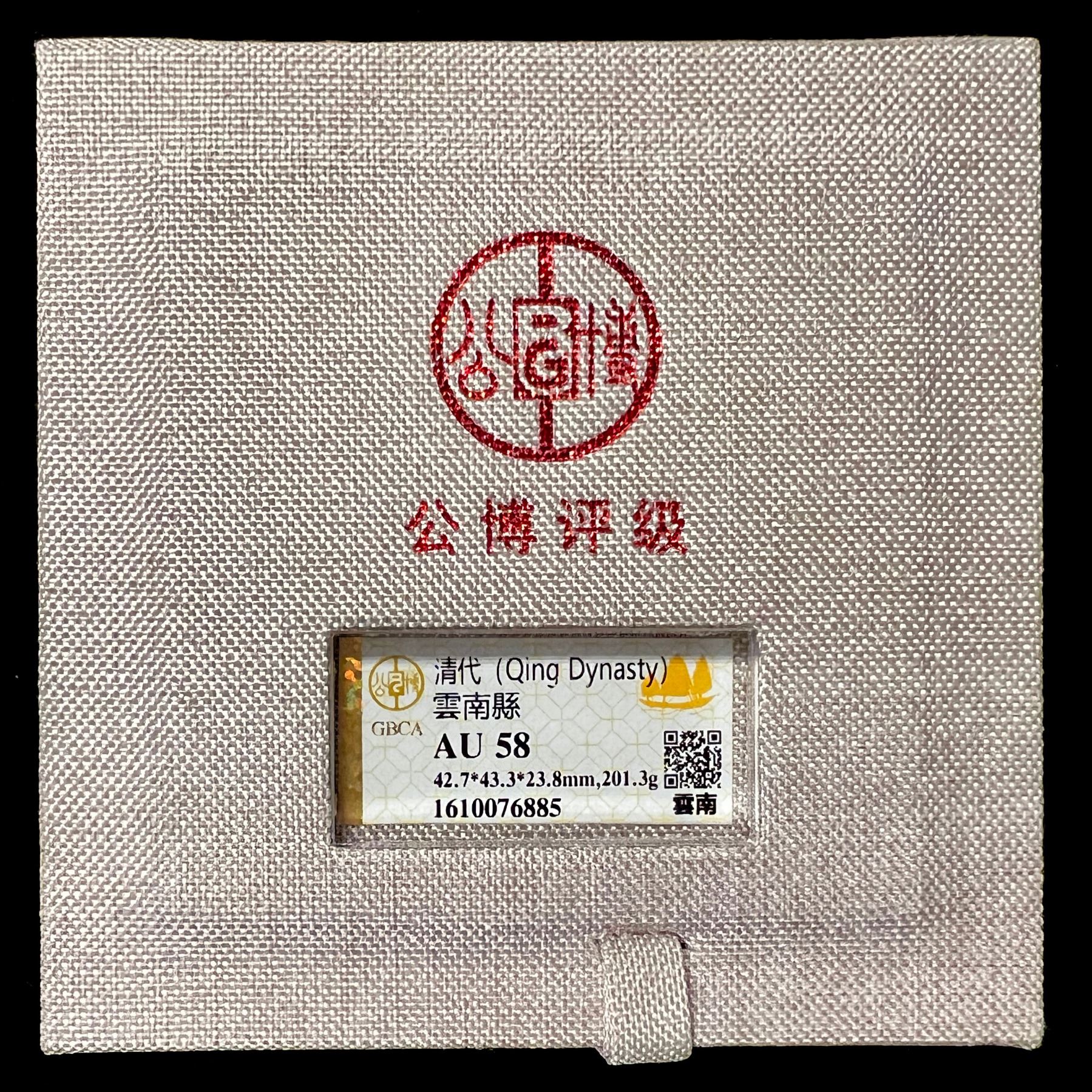 CHINA: Qing Dynasty, AR sycee (201.3g), silver ingot with yun nan xian ("Yunnan County" under Dali Fu) stamped at center, GBCA graded AU58, ex Robert A. Rosenfeld Collection.