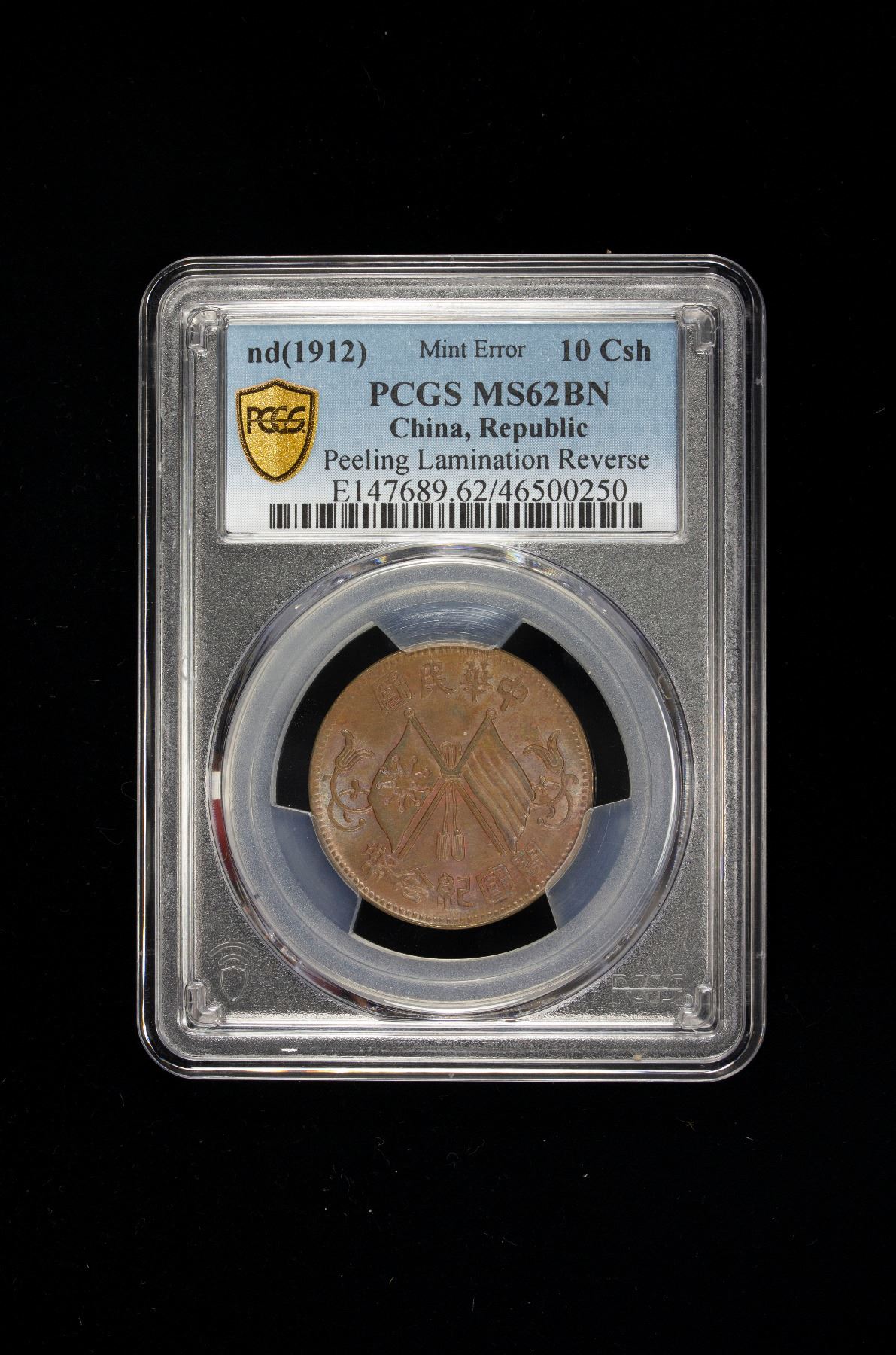 CHINA: Republic, AE 10 cash, ND (1912), Y-301, crossed Wuchang Uprising and Five-colored flags, lamination split error, PCGS graded MS62 BN.