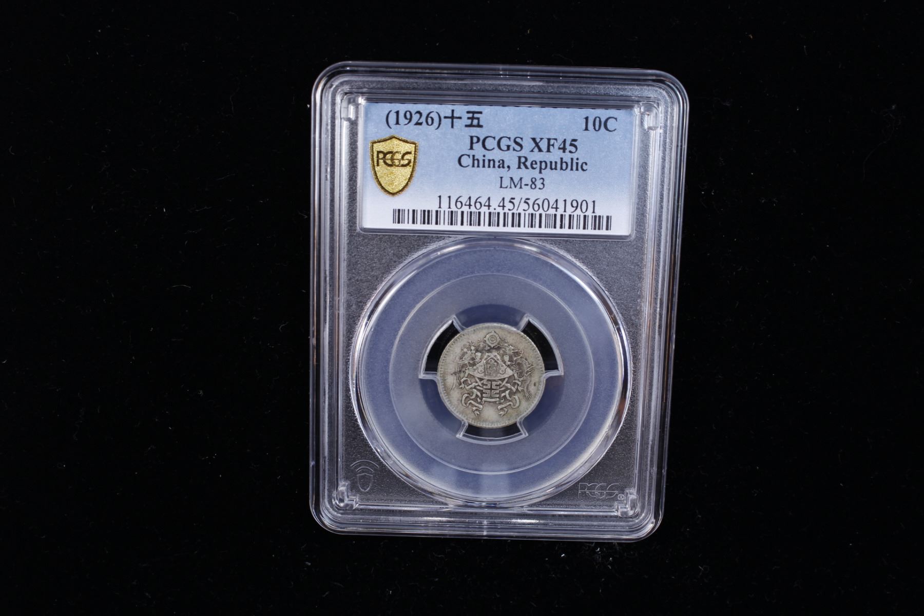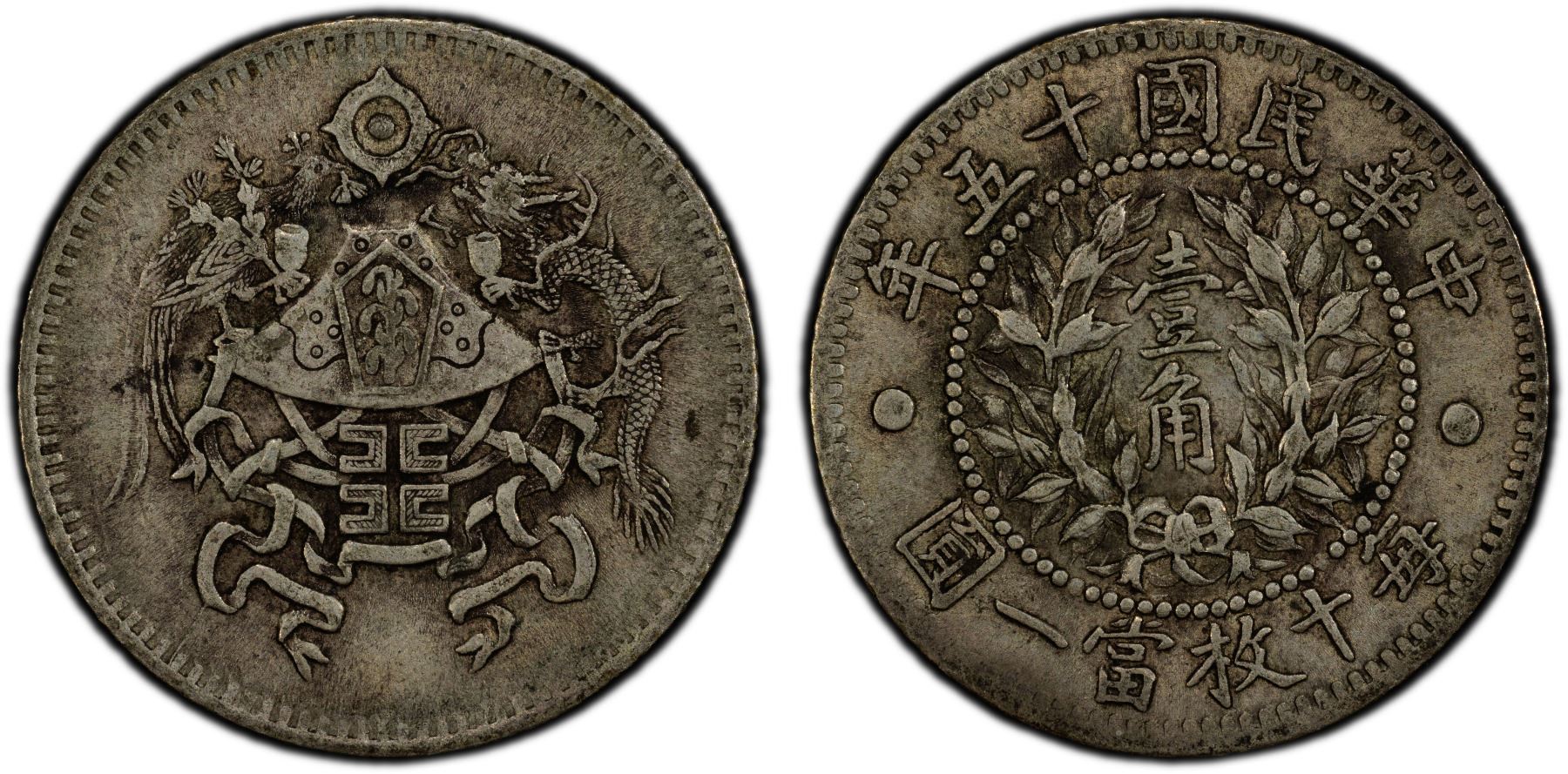 CHINA: Republic, AR 10 cents, year 15 (1926), Y-334, L&M-83, Twelve Symbols national emblem, PCGS graded EF45. The Twelve Symbols national emblem was the state emblem of the Republic of China (1913-1928). It was based on ancient Chinese symbols, known as the Twelve Ornament. The symbols were considered most auspicious and therefore as a set were previously reserved only for the emperor to be shown on his ceremonial robes. The national emblem arranges these symbols in such a way to reflect the order of achievement in western heraldry.