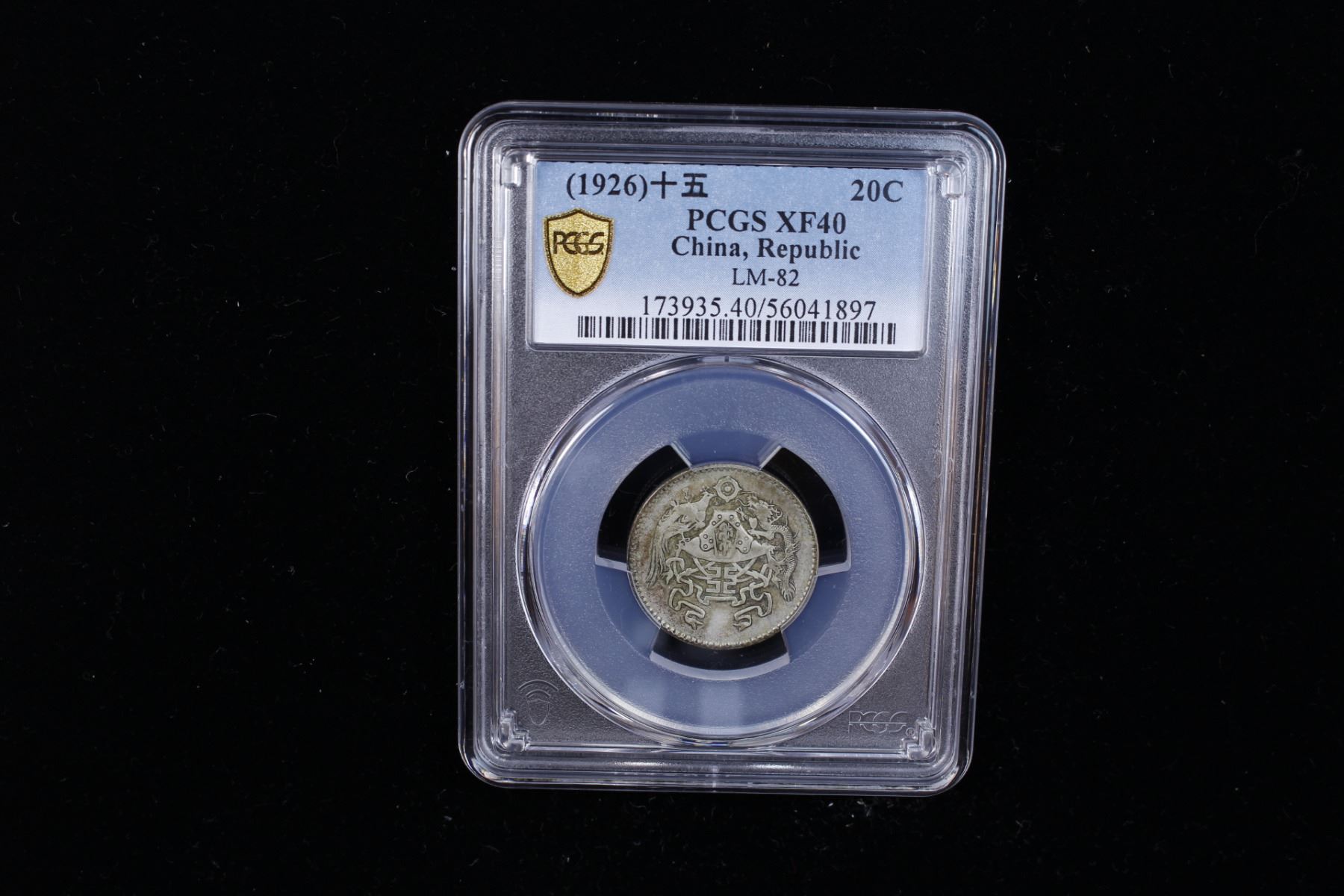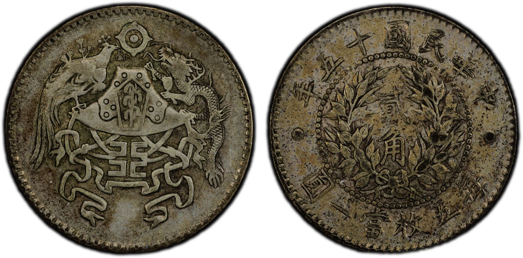CHINA: Republic, AR 20 cents, year 15 (1926), Y-335, L&M-82, Twelve Symbols national emblem, PCGS graded EF40. The Twelve Symbols national emblem was the state emblem of the Republic of China (1913-1928). It was based on ancient Chinese symbols, known as the Twelve Ornament. The symbols were considered most auspicious and therefore as a set were previously reserved only for the emperor to be shown on his ceremonial robes. The national emblem arranges these symbols in such a way to reflect the order of achievement in western heraldry.