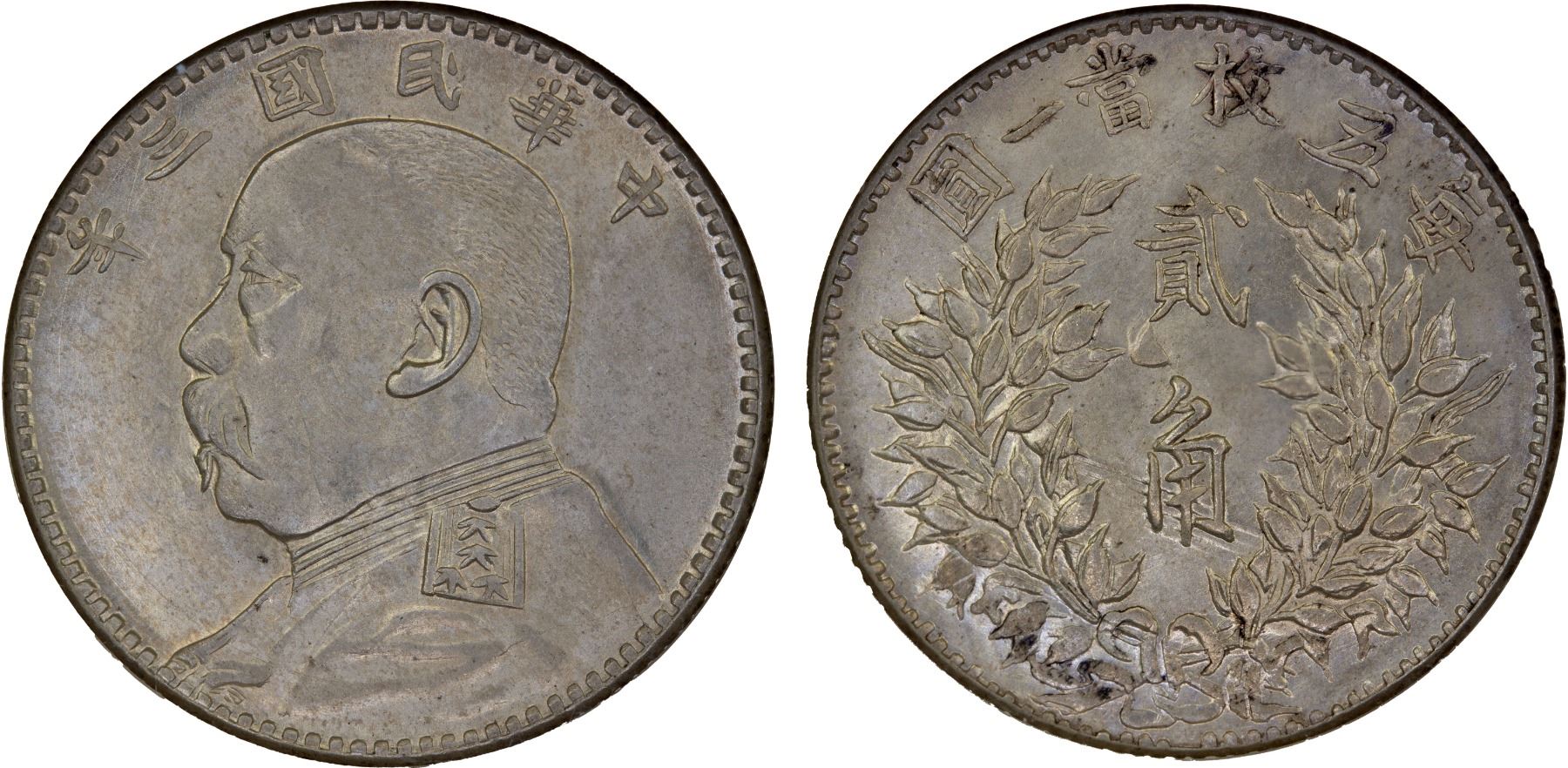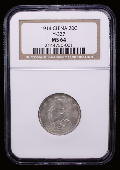 CHINA: Republic, AR 20 cents, year 3 (1914), Y-327, L&M-65, Yuan Shi Kai in military uniform, lightly toned, nice eye appeal, NGC graded MS64, ex The 1914 Collection.