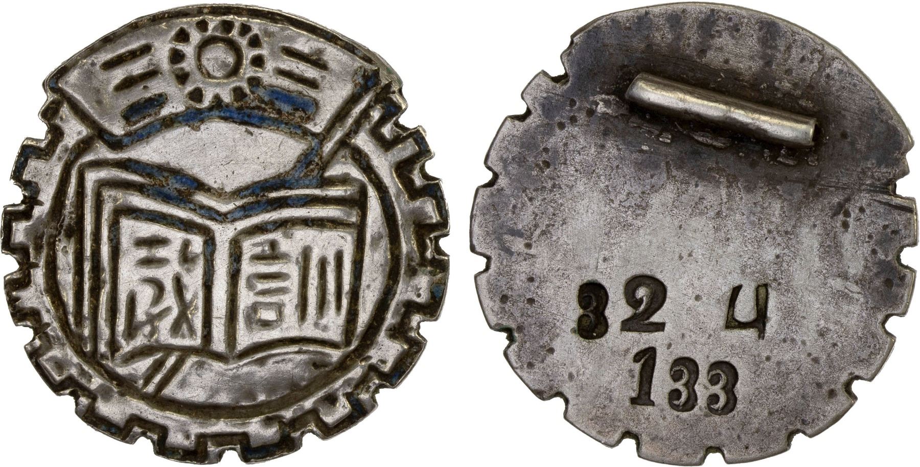 CHINA: Republic, AR badge (8.32g), 29mm, hand-engraved silver badge, xun / jiao ("train, teach") on open book, diagonal staff behind, the White Sun emblem of the Republic of China above, cogwheel around with crenulated edge, obverse with traces of blue enamel, reverse stamped with "32 4 / 133" and attached with pin tube (no pin), VF. The numbers on the reverse possibly refer to the military organizational number of the recipient.