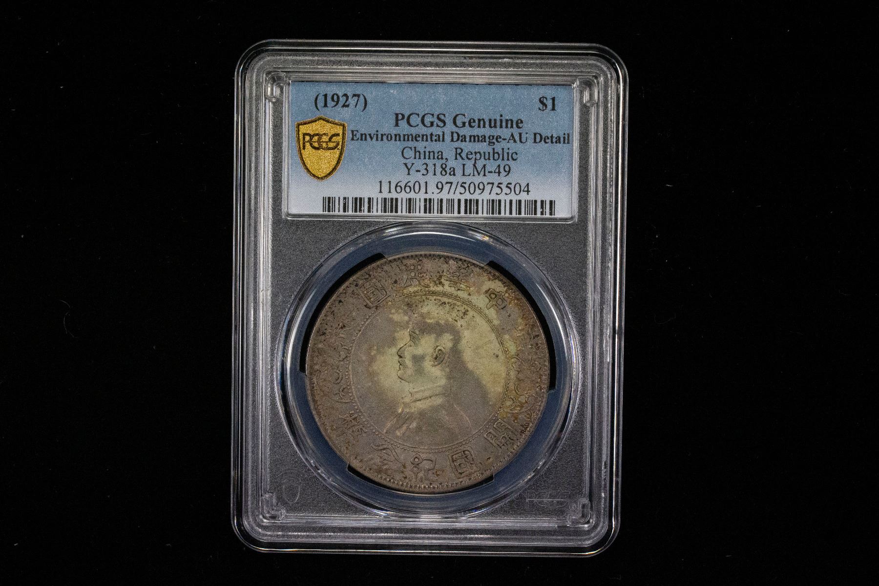 CHINA: Republic, AR dollar, ND (1927), Y-318a.2, L&M-49, "Memento" Dollar type, Sun Yat-Sen portrait, environmental damage, PCGS graded AU details, ex Almer H. Orr III Collection.