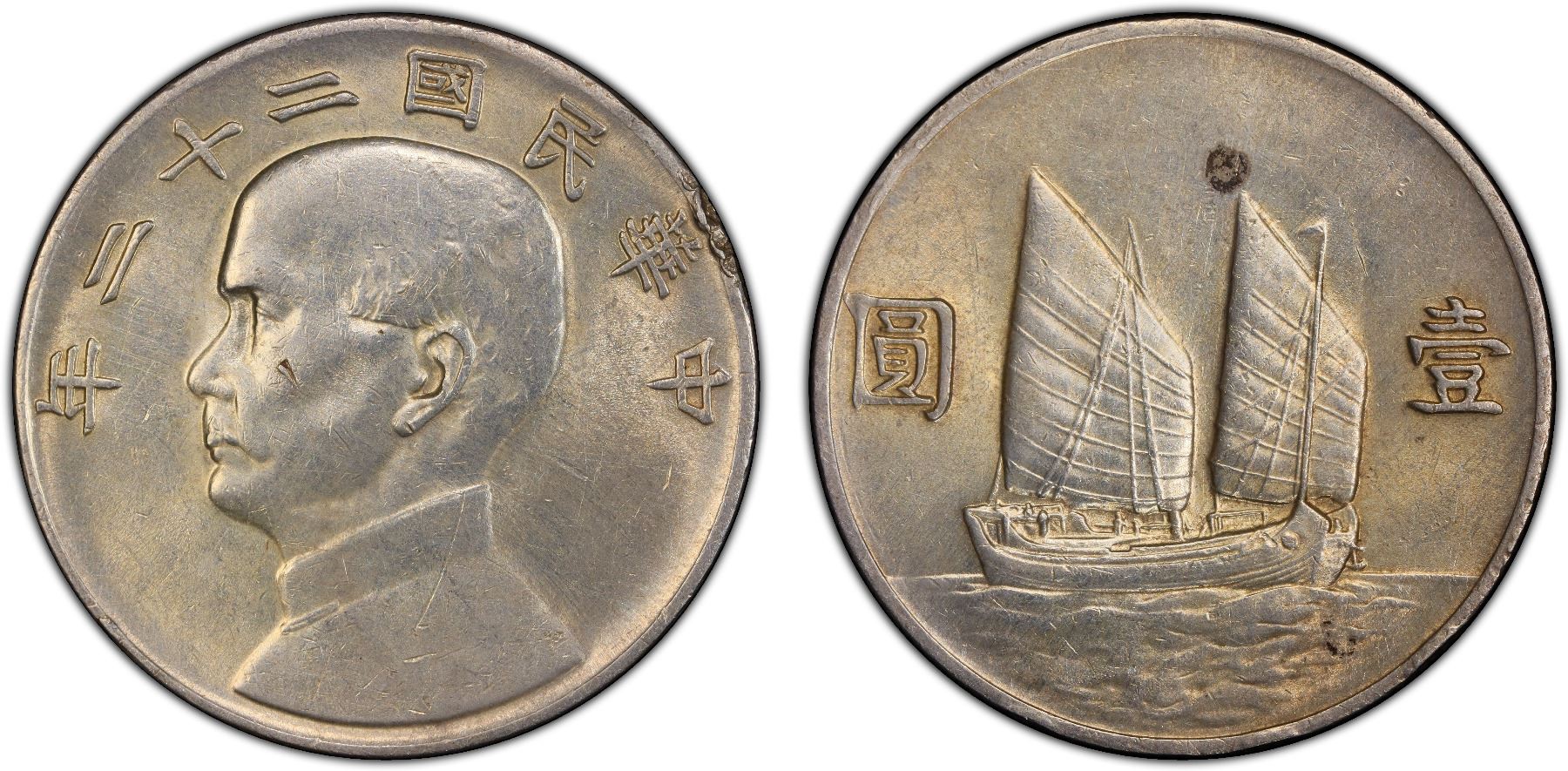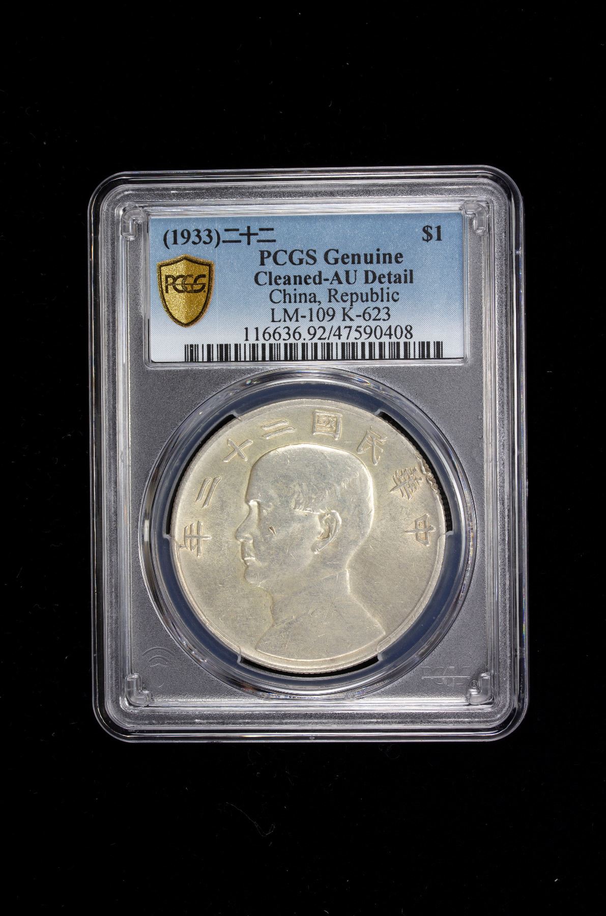 CHINA: Republic, AR dollar, year 22 (1933), Y-345, L&M-109, K-623, Sun Yat-sen, Chinese junk under sail, better date of the two-year type, cleaned, PCGS graded AU details.