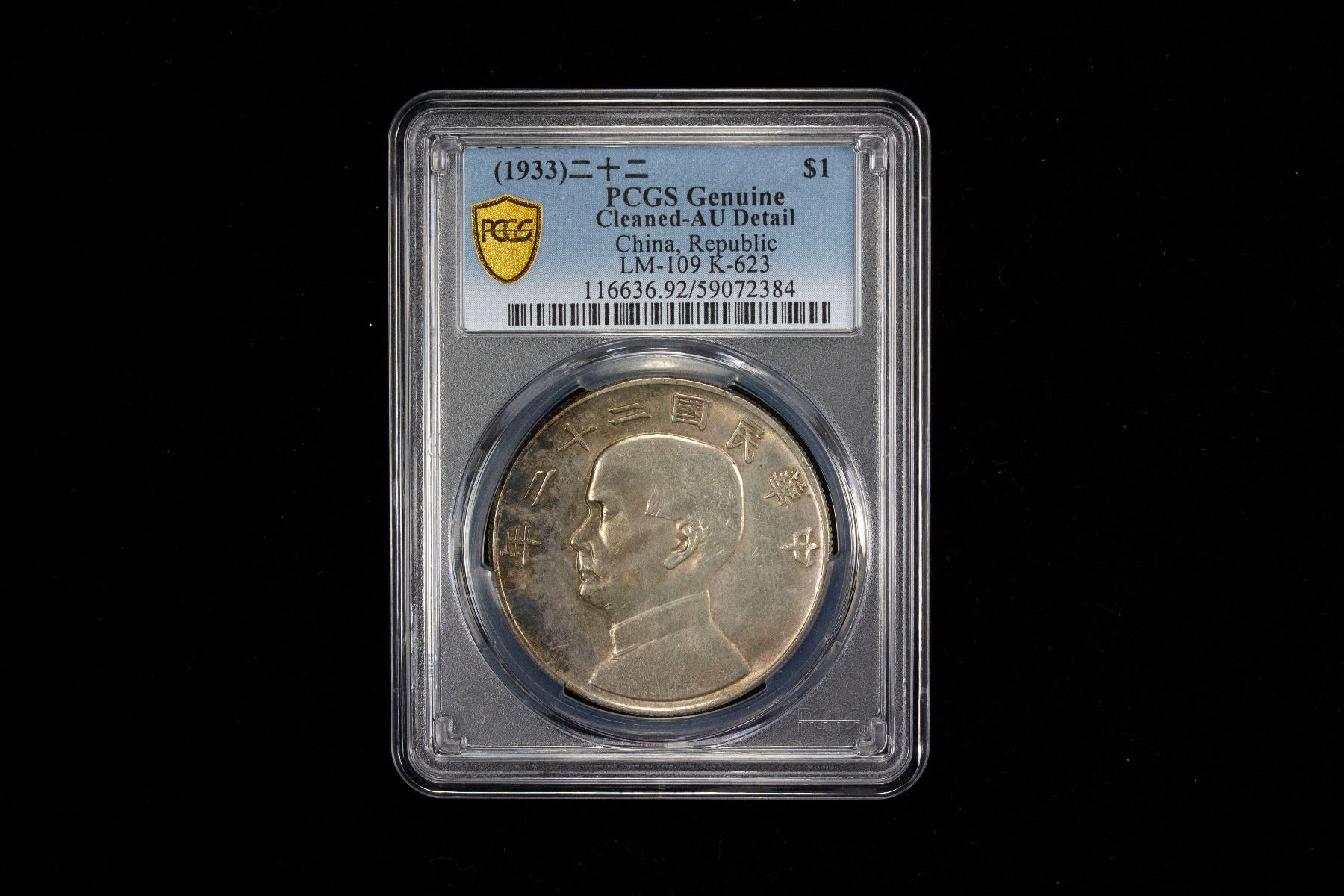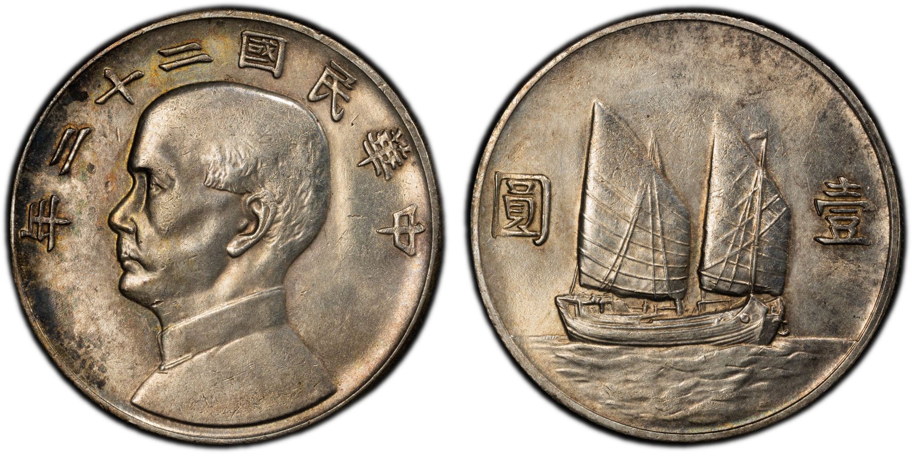 CHINA: Republic, AR dollar, year 22 (1933), Y-345, L&M-109, K-623, Sun Yat-sen // Chinese junk under sail, better date of the two-year type, cleaned, PCGS graded AU details.