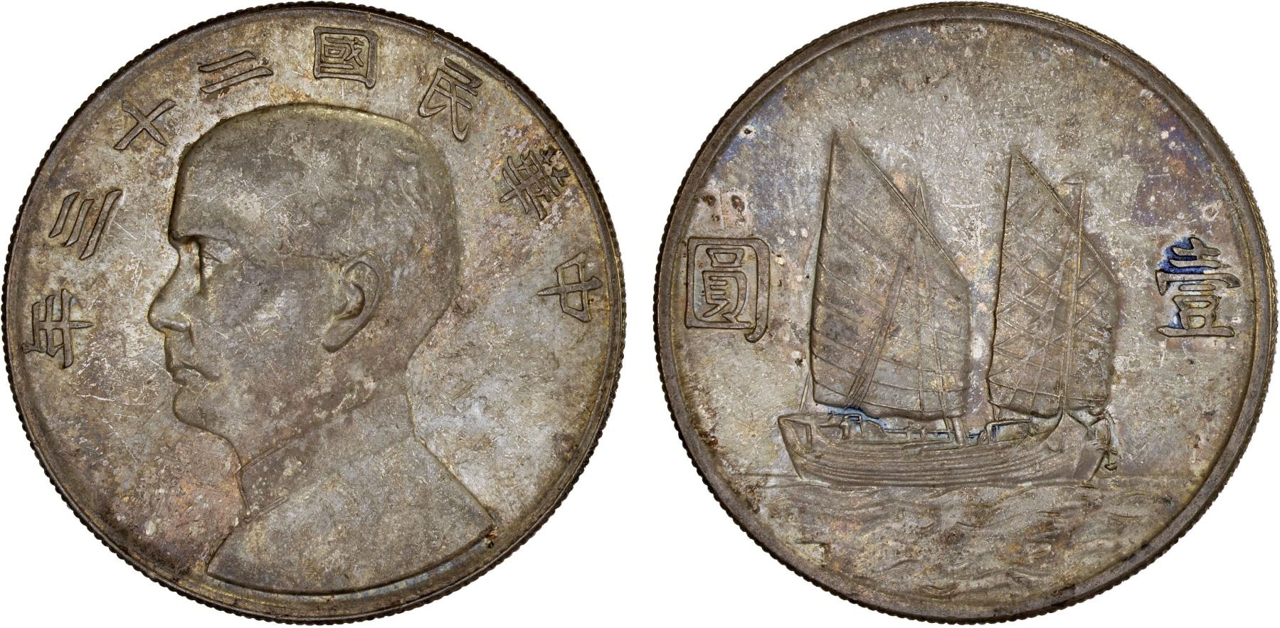 CHINA: Republic, AR dollar, year 23 (1934), Y-345, L&M-110, K-624, Sun Yat-sen // Chinese junk under sail, lustrous with light iridescent toning, AU-UNC