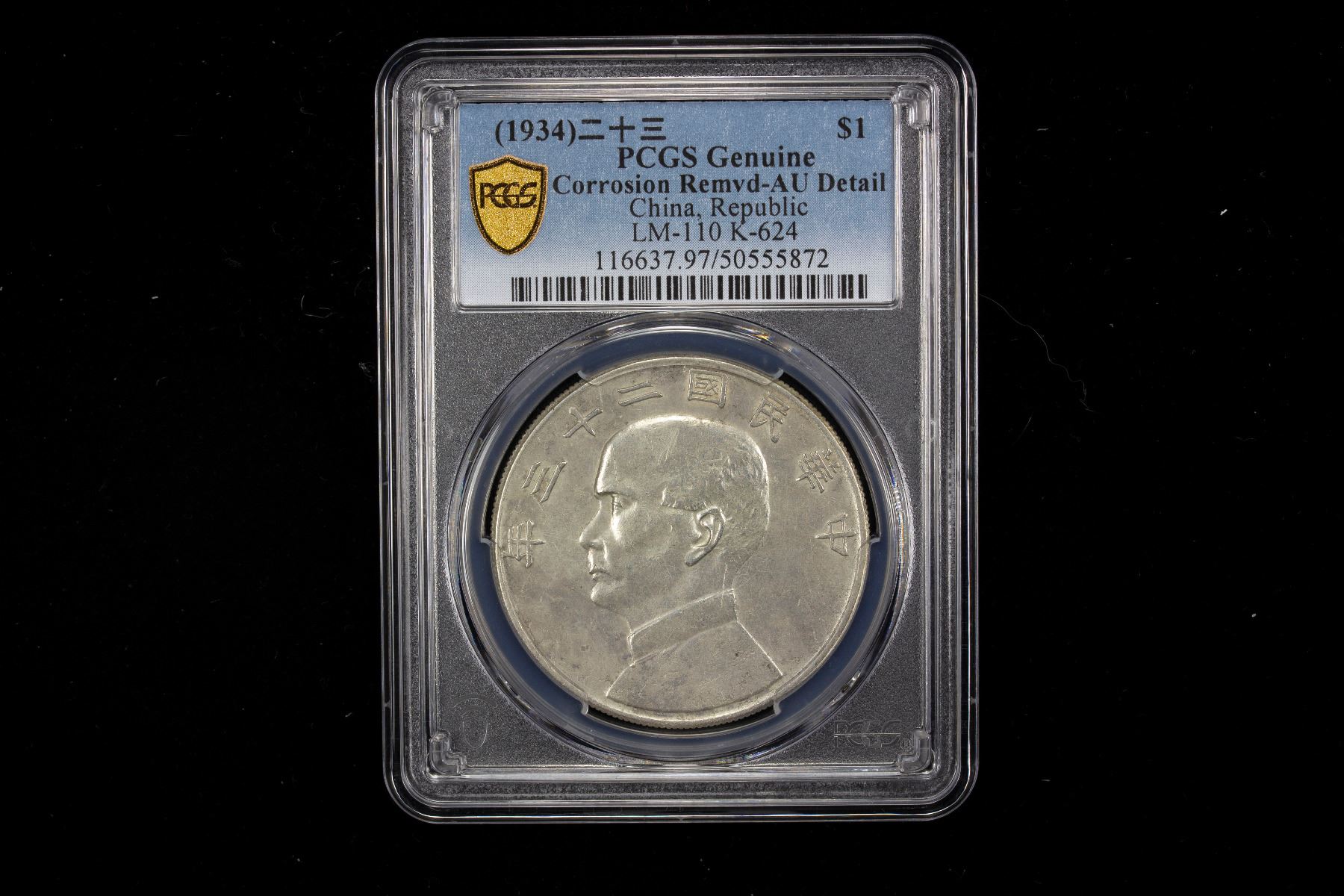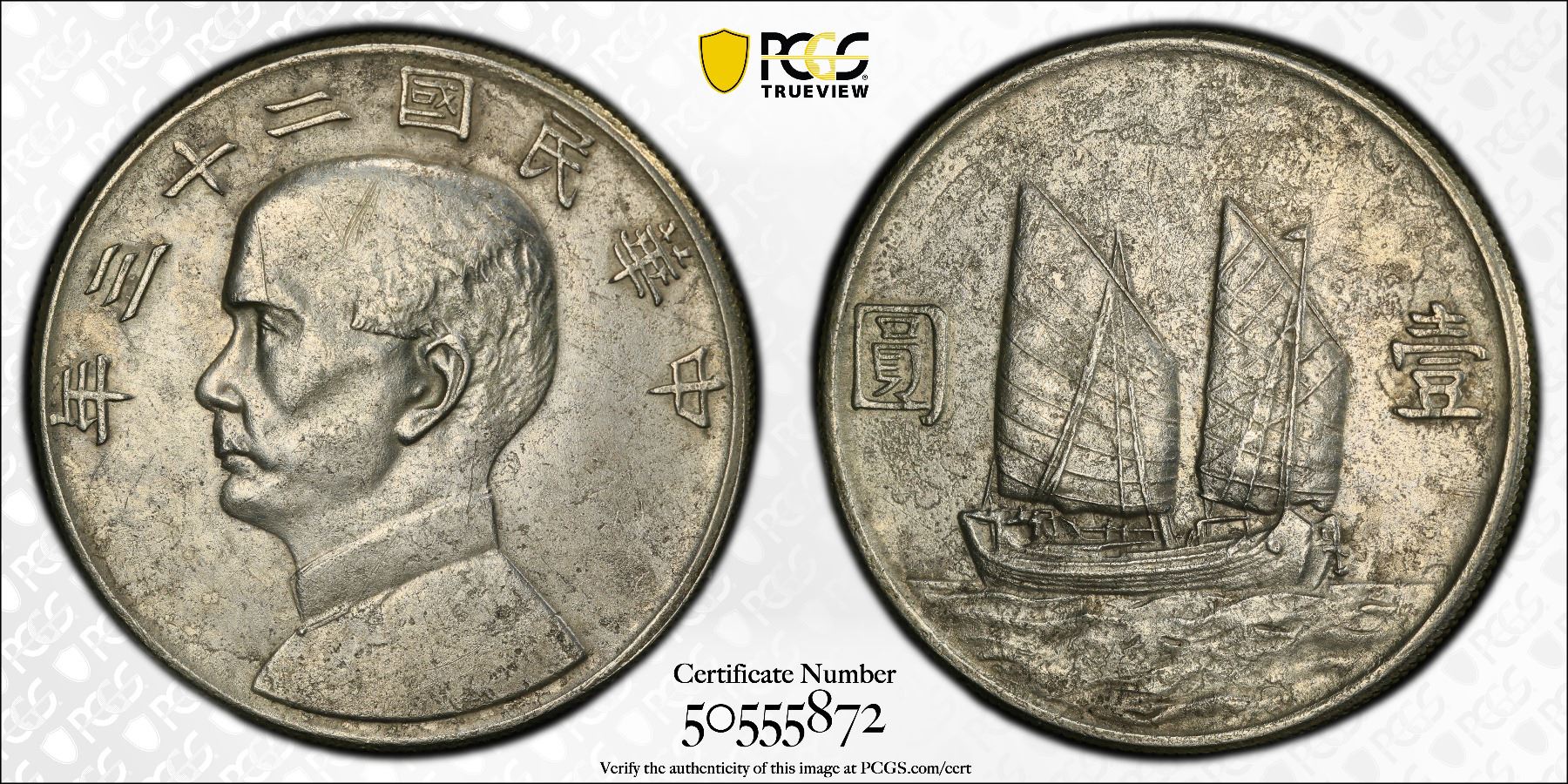 CHINA: Republic, AR dollar, year 23 (1934), Y-345, L&M-110, K-624, Sun Yat-sen // Chinese junk under sail, an attractive mint state example, corrosion removed, PCGS graded AU details, ex Dr. Dirk Löer Collection.
