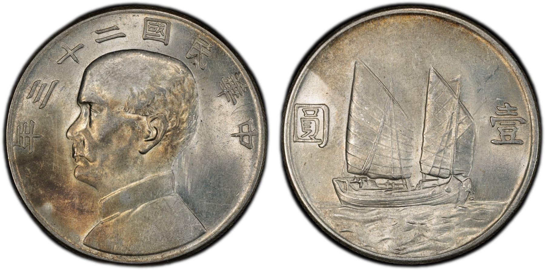 CHINA: Republic, AR dollar, year 23 (1934), Y-345, L&M-110, K-624, Sun Yat-sen // Chinese junk under sail, an attractive nearly mint state example, PCGS graded AU58.