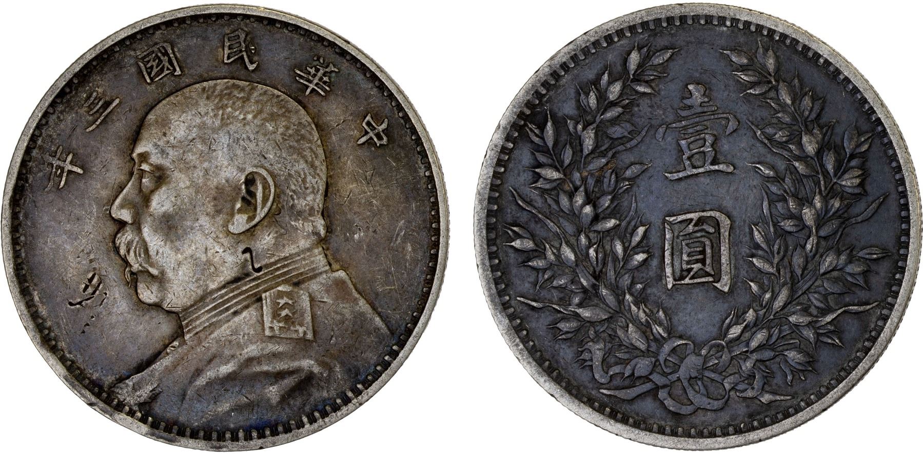 CHINA: Republic, AR dollar, year 3 (1914), Y-329, two large Chinese chopmarks on obverse, deeply toned, Choice VF.